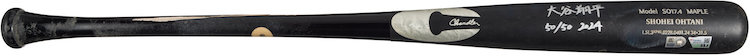 Why it’s Buzz-worthy: This fully authenticated gamer is signed in kanji and inscribed to his historic 50-50 season where this photo-matched bat was confirmed to have been used for his seventh, eighth and ninth homers of the legendary MVP campaign that was one for the record books. (See it all at the link.) "You can be certain that a global audience will be competing for this Chandler SO17.4 lumber," reads the Heritage listing and that's a subtle statement considering this piece is as nice as it can get -- short of a historic plateau or moment piece -- for the biggest name in the game today.