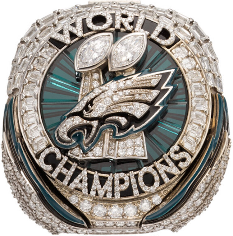 Why it’s Buzz-worthy: Estimated to top $80,000 when it's over, this ring went to the player and will soon go from his hands to a collector needing the ultimate Eagles piece. "It was consigned to auction by rookie offensive tackle Laekin Vakalahi himself, a massive New Zealander who earned notice from the Eagles' international scout as a rugby player in Australia," according to Heritage. "The ring's bezel contains 145 diamonds -- one for each of the Eagles' record-setting 145 playoff points, the most in NFL postseason history. 'World Champions' is spelled out in 40 points of diamonds, commemorating the team's 40-point output in Super Bowl LIX." You can see more views and learn even more about the ring's unique features at the link.