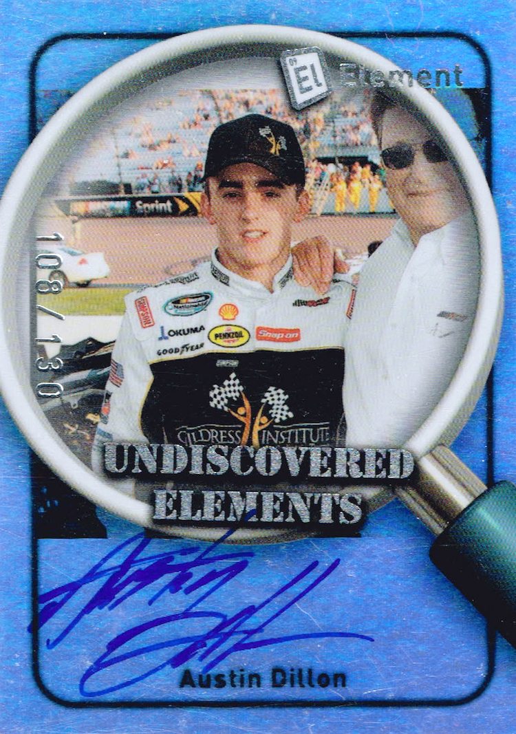 Dillon's cardboard debut came nine years ago in 2009 Press Pass Element where he was a 18-year-old newcomer in its Undiscovered Elements subset. He's shown alongside Childress on that one -- his only Rookie Card -- and on his first certified autographs which are also found there. His standard autograph is limited to 130 copies, while a red-ink version is limited to 25 -- and they both feature a full signature quite different than what he signs today.