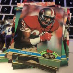 What's Buzz-worthy: Ripping this one is all about chasing one of the top Brett Favre Rookie Cards out there -- one that misspells his last name "Farve" and was not corrected. This is a big set and that fact that lowers your odds of finding Favre inside a single pack. Assuming perfect collation, you'd land him in every 42nd pack -- so roughly every other box (36 packs per box) -- but that caveat is not easy. I don't think boxes were shrink-wrapped that first year and the cellophane wrappers are clear enough you can see who's on the top and bottom of packs. I'm not sure if collation of this one was like standard Topps at the time (I didn't buy much of this then), but it's very possible that cards are always in the same order each time. That's a bummer -- but at least the packs can't be opened and re-sealed easily. Good news here? Packs are cheap and there are 48 RCs in the set that aren't Favre and there are some big names from the NFL at the time -- this pack had Jerry Rice and some memorable names who are ultimately commons today. If you want to pull a Favre, it's do-able if wax is from a trusted dealer who isn't searching packs. But if you want it bad you can find graded copies for relatively affordable amounts. (His 1992 High Series is tough and his first Packers card from the brand. The series is rare and will cost you about $25 a pack -- if you can find it.) You have to open these carefully as to not damage the cards. They can stick together but not to the point where they peel paper off of the next card. You can suffer color loss if you're not careful -- so if you tear into these tear in slowly and carefully.