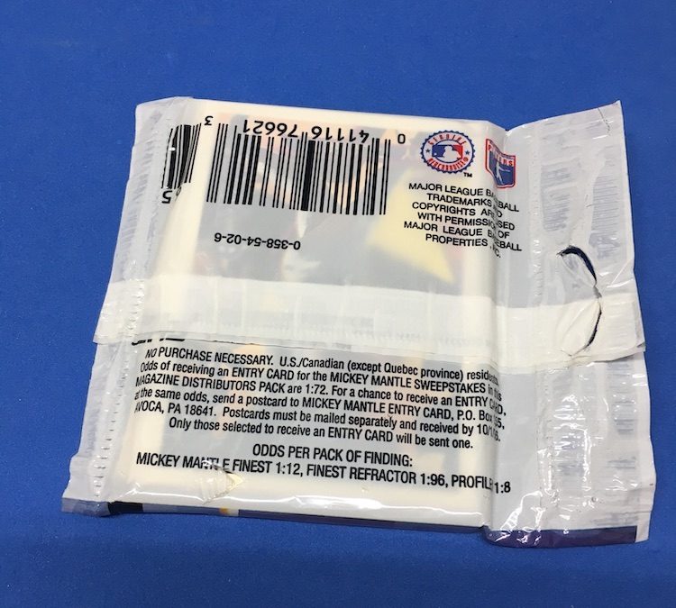 What's Buzz-worthy: I picked up a few retro packs from the past -- nothing that'll break the bank -- and this one is the last of those (for now) beyond some oddball non-sports selections. For this Flashback Friday rip, I figured this one was appropriate as we'll likely be seeing the first glimpses at 2026 Topps any day now, which will also make this one 30 years old as the calendar flips. This year's release was an ode to Mickey Mantle where his No. 7 (in Series 1) was the final No. 7 card for years until it was un-retired for new a Mantle appearance in 2006. (Yes, that means all flagship Topps sets in between did not have a No. 7 card.) This jumbo pack is a retail version sold mainly via magazine distributors (hence that name and the hanger hole for a spot on a rack) and the only chases here needing odds were Mantle Finest inserts, their Refractor counterparts and then Profiles cards like the one I landed one here. There's not a boatload of stuff to be found here -- it's one of the smallest Topps sets of the modern era -- and the chases are lean, but those Mantles are still sought after. This pack included some of the top possible names for sure among the veterans but the mess of rookies is rough as was typical back in the day (pre-2006) for many brands not named Bowman. Atop that, 1990s packaging and drama along the way meant a lot of mangled cards here with the Griffey getting the dreaded pack-seal "parallel" that can still pop up from time to time (at right). This was a cheap pack so I didn't expect anything, really -- and it's probably been 25-plus years since I opened any -- but it wasn't bad. That $1.99 price for a pack wasn't bad back then, either.