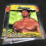 What's Buzz-worthy: I found this one quite a bit ago and kind of forgot about it after it arrived with a rather beaten-up box -- so much so I didn't take photos -- but with some of my Black Friday stuff still on its way to me I figured a Throwback Thursday-style Buzz Break might work. This one is a colorful release from the Fleer years for WWE and it's loaded with big names from the past, memorable favorites and some second-year cards for top stars like John Cena, Randy Orton, Batista and Stacy Keibler among others. It's clean compared to some releases when it comes to the printing and cutting, too, making this one a decent rip, though the prices for most Fleer hobby boxes is way nuttier than the typical returns if you open them right now. Why? The boxes basically don't exist right now. I found this on the cheaper side of things -- the only way I'd rip -- and it delivered a full set, dupes with some good names in there, all the inserts it should odds-wise and two hits. Ink here is not deep -- in fact, they don't even make the in-pack checklists -- but everything else is. The lineup is a simple one -- I found pretty much everything that's in there or the norm for a box -- and that limited my buying for this one back in the day. I bought plenty -- but not as much as others -- as the blaster boxes included a hit every time with a price ($9.99) that undercut the hobby boxes really, so I know I ripped more retail vs. hobby as ink is not easily found (and odds were not posted). All in all, this one was a good break since I found the box at a low, low price but ultimately that was a bit of a fluke.