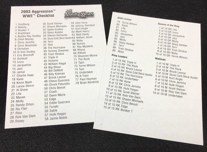 Notables on base cards – Goldberg, Batista, Chris Jericho, Goldust, Ivory, Kevin Nash, Lita, Molly Holly, Randy Orton, Ric Flair, Rob Van Dam, Shawn Michaels, Stacy Keibler, Steve Austin, Trish Stratus, Triple H, William Regal, Brock Lesnar, Dawn Marie, Edge, Eddie Guerrero, Sable, Hulk Hogan, John Cena, Kurt Angle, Rey Mysterio, The Rock, Torrie Wilson, Tazz, Undertaker, Paul Heyman ... and others