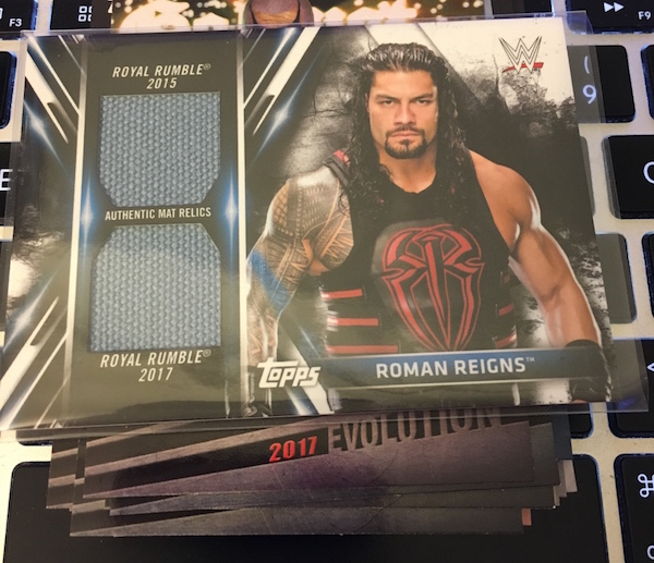 What's Buzz-worthy: This box delivered pretty well with a rarer double Relic for a top star, a numbered parallel and some strong names across the board. It's not the flashiest box, but it's an A box. ... As said before, the formula of recent years works here -- and it works pretty well -- with a couple of tribute sets (one depending on where you buy ... this was a Walmart box) and an array of parallels. The new insert here -- one that I think is relatively unique and helps this one -- is Evolution, a set that takes us through the various iterations of a character or characters a wrestler has used. Some of the inclusions there are ones I don't think have seen cardboard before. The photography here is pretty solid in some spots but this one just felt like it needed something more. The parallels are colorful and easy to spot, but do feel a little bit bland. ... There are belt Relics to be found in these (a negative to me) along with the mat and shirt Relics and, more importantly, you do get a shot at autographed Relics and other hits like printing plates at longer odds. (One in 85 boxes on plates, one at 236 boxes and up for a few versions of ink.) I'll undoubtedly tear into more of these in the coming weeks, though hobby is the stronger and safer bet for your buck with an autograph in every box. The names you don't see in this one -- notably Ronda Rousey -- means you'll probably get them all in Series 2 this fall. All in all, this one's on par with flagship sets of recent years, I just feel like these need some "other" type of card to mix things up and add to the variety -- something as simple as a fold-out card. Otherwise, it's a strong basic brand that offers a good amount of first-time cards -- and a few first-time autos -- along with the hits.