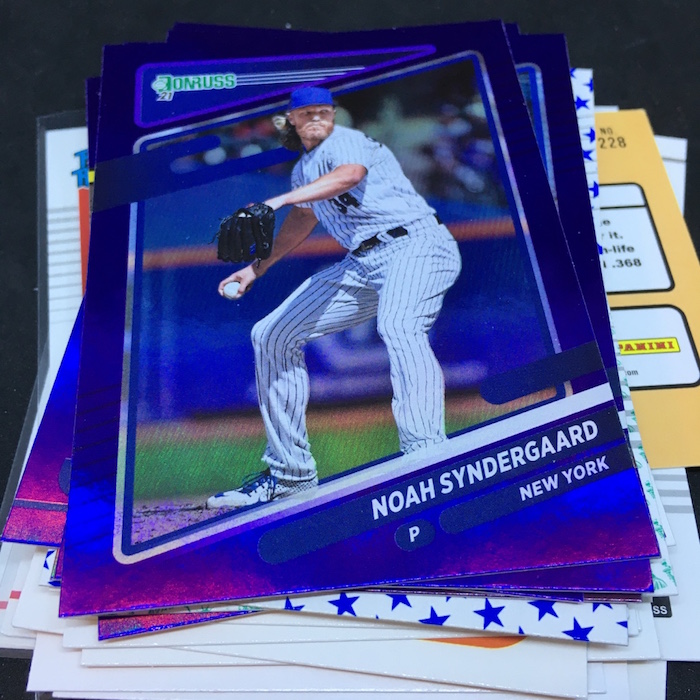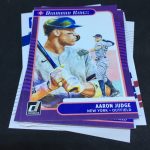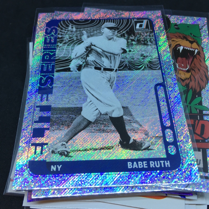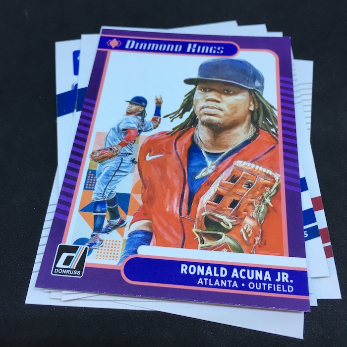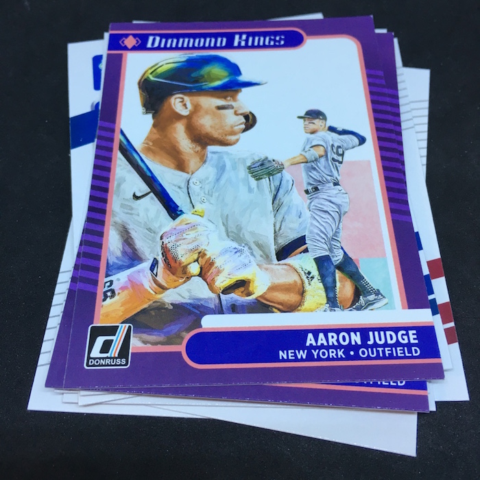 What's Buzz-worthy: This one was jam-packed with good names -- that alone gets it a top nod from me -- but this one also was the home to the three variations that are not obvious when you pull them -- see the notes above and close shots below. The Ruth appearances are pluses as are two Unleashed cards (I thought they were rarer, maybe not) and then Franco. The Conforto is perhaps a norm kind of hit here (young slugger) but I like that one, too. All in all, I liked this one for a standard blaster price. ... As noted last time, this might be the strongest overall package of Donruss baseball to date because it breaks away some from the old in favor of some new. The Diamond Kings design, for example, is a little funky but it's not locked into a 1980s framework of the past, so it gets points from me for trying something new. The main design is crisp and clean -- better in-person vs. mocks -- and it is so strong I think it helps make this one perhaps the best release in the return of the brand. (It will be strong when it gets an Optic treatment, too.) There doesn't appear to be a tell to know which cards are SPs unlike past years, but the nicknames for players or their cities are the most-common way to find nearly all of them and they are all on the backs of packs here so keep that in mind when opening. The Holo Purple parallels are unique to blasters (hangers have Orange, which I think are stronger) and the Rapture parallels do help add variety to the mix. The hobby boxes deliver a boatload of variety and a larger range of stuff -- some might say too much -- but I think that's what's needed in any flagship-style release.