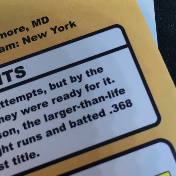 Variations (10) – Babe Ruth (first line of highlights ends with "the" and not "time"), Christian Yelich (first line ends with "a ways"), Starling Marte (no space between "ARI/MIA" and stats), Sammy Sosa, Rickey Henderson, Nolan Arenado, Jacob deGrom, Joey Gallo, Jose Altuve, Aaron Judge