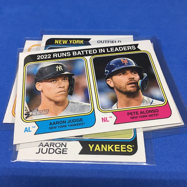 Notables on base cards – Aaron Judge (on six cards!), Ronald Acuña Jr., Pete Alonso, Shohei Ohtani, Spencer Strider, Austin Riley, Max Fried, Luis Robert, Bryce Harper, Byron Buxton, Corey Seager, Jeremy Peña, Vladimir Guerrero Jr., Mookie Betts