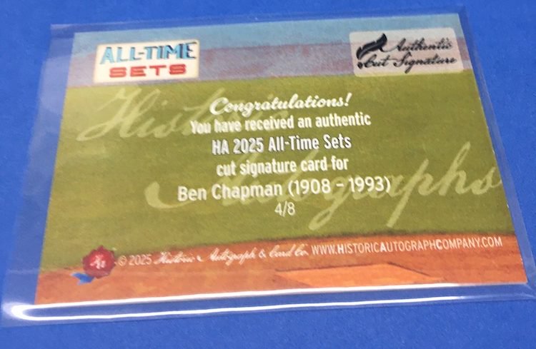 What's Buzz-worthy: This one is very niche -- a set that perhaps aims to pull some of the dedicated older vintage (pre-war and more) collectors into some modern flash with "re-imagining" top names from top sets in the past on new cards with various colorful foilboard textures and designs. The base set here is only 800 copies per card and this box included one of everything from each tier (parallel) save for the rarest (/25 for Tier 8) -- but instead I landed a cut auto from a name that has a firm place in MLB history. At first, I thought I had an auto of Ray Chapman -- the only player killed by a beanball in MLB history during a game -- but I knew the Chapman name from somewhere else. While he was a four-time All-Star and a World Series winner as a member of the 1932 Yankees, Ben Chapman has an ugly place in the history of the game. He was the manager of the Philadelphia Phillies who openly heckled and taunted Jackie Robinson with ugly racist comments that led some to call for his suspension from MLB. (A perhaps somewhat-sanitized take on it can be seen in the film 42 where he was played by Alan Tudyk here.) In 1972, Robinson told TV host Dick Cavett "Ben Chapman was perhaps the most vicious of any of the people in terms of name calling. ... He was quite vicious ... wasn't only vicious as far as black people are concerned. I think he was anti-everything." Now, obviously this isn't the kind of autograph I'd seek out, but it being a negative in the game's history doesn't make it an unimportant one. His place with the Yankees and a championship actually looks to have bolstered his value a bit more than I would have expected, too. Cut autos here are one in 11 boxes (the boxes incorrectly say packs instead of boxes) so this box beat the odds and the product grade, for me, shows how there are some strong cuts and other finds here that give this one potential for fireworks at a lower box price (a case, as available at the link above should include at least one cut, maybe two) and more. Yes, the base cards can be funky but some big names have a few cards in the set and that means they can pop up across the tiers as well as via other rarer parallels (/4) and printing plates. Also in here are buyback vintage cards, handwriting sample cut cards and more -- and all of the various inclusions, should appear in every case based on the odds -- and you can see the cuts list there, too. I landed this as part of a bundle with a really low price to make it low-risk and the cut makes that a win atop all cards here being relatively rare volumes. Would I try it again? Maybe ... there are some big autos that could be in there and even handwriting sample cards would be a fun find, too.