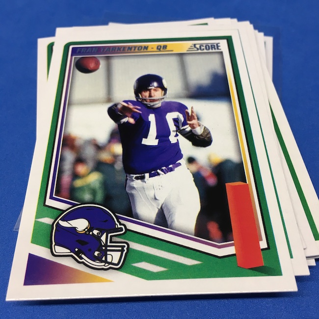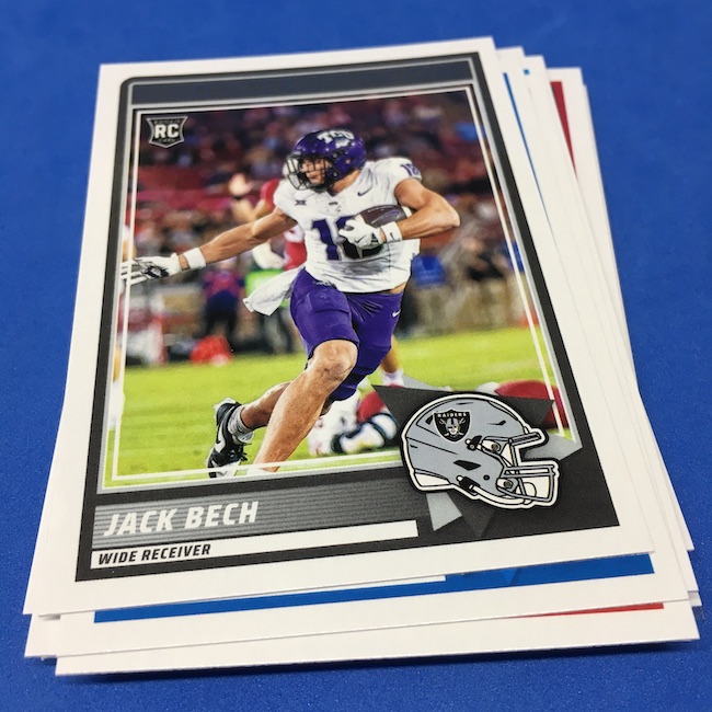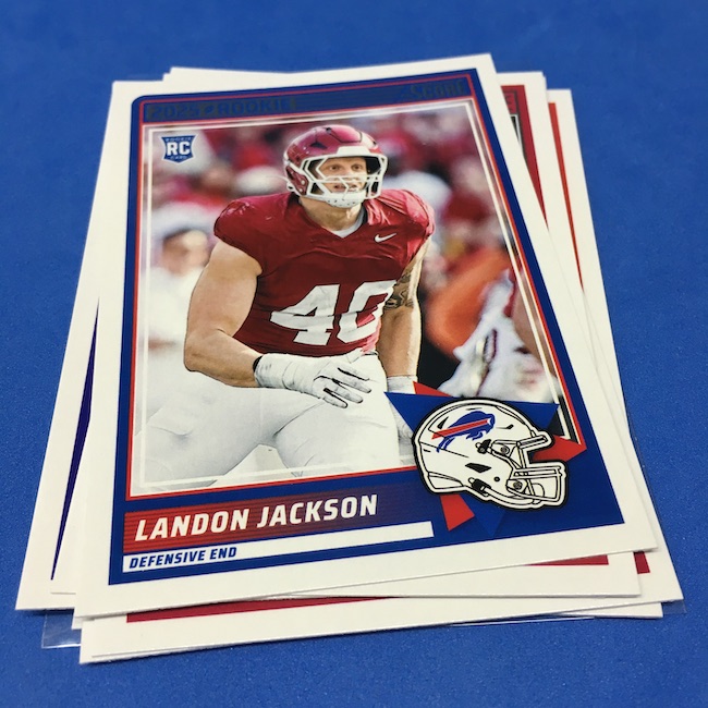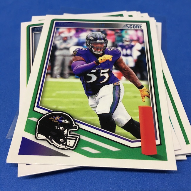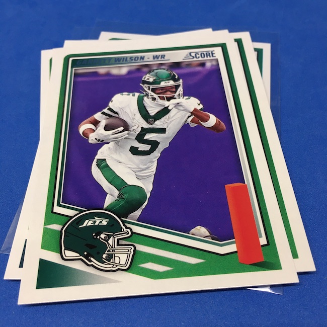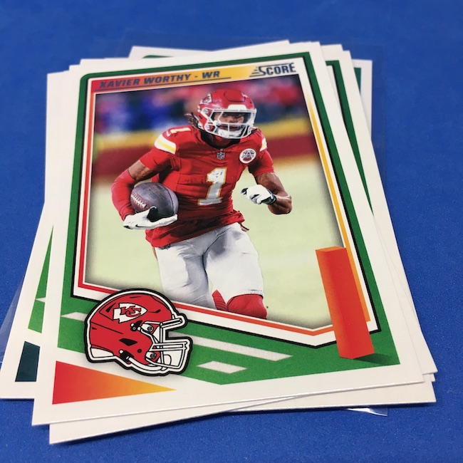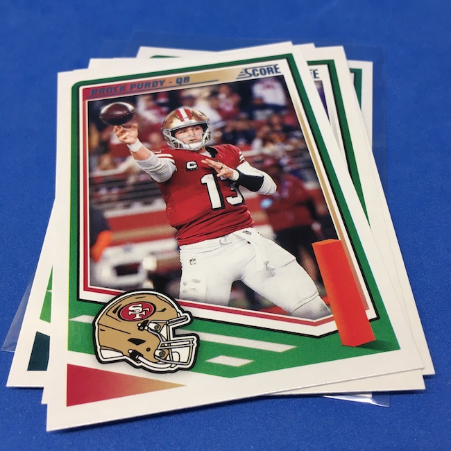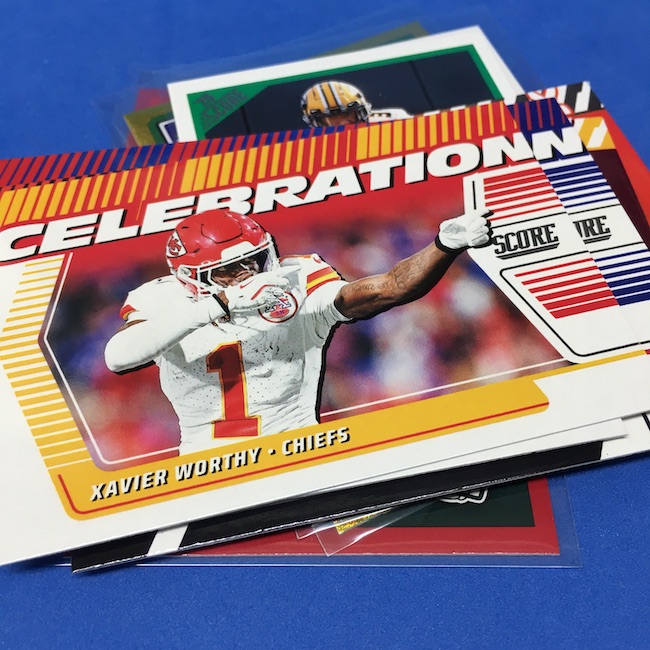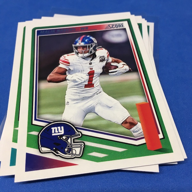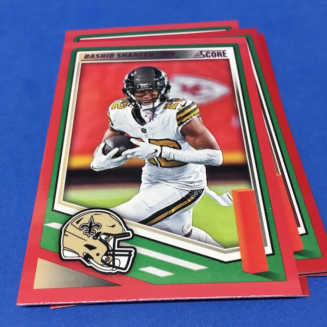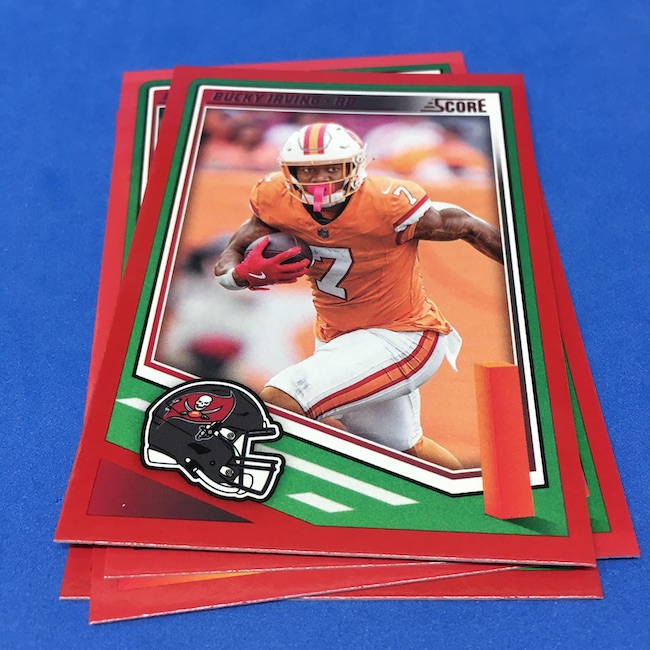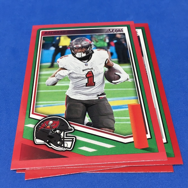 What's Buzz-worthy: I'm not 100-percent sure if my two previous blasters were abnormally good -- I landed a memorabilia card in each of them -- but this larger box seemed like it was about the same save for the parallel volume and a lot more base. A few inserts had more volume than a blaster ... but it was close. The numbered parallels were the same volume here vs. my last blaster while the Reds are cleaner and nicer than Greens ... but I feel like I could have just done a pair of blasters here and come out ahead if all blasters include a numbered card and a traditional hit (auto or memorabilia). ... The mix here is fun at a modest price -- something any and all retail-aisle boxes needs right now -- and this one is still a win for a collector with a lot of past and present variety and insert volume. ... As I noted before, I came really close to giving this product an A+ grade, too, but one thing that I know is bugging some collectors here is a bit of a love-hate enigma for me, too. That pylon. Do I love it? Do I hate it? Perhaps a bit of both -- I think there might be less conflict in my design mind if the helmets near them were also three-dimensional images skewed along those stripes or perhaps if the pylons were simply smaller ... but they do make this one unique. ... A weird part this year is the rookies being pulled out to their own 100-card checklist and not numbered as part of the base set with the veterans. By definition, this makes them insert cards ... for those who care about definitions. The insert designs also feel more crisp and modern vs. a 1990ish homage and a nice surprise was the 1990 MLB design being used for the throwback rookies this year (35th anniversary there). That design hasn't, off the top of my head, been revived that much since back then. This one is a throwback break in a lot of ways -- back to the days of long ago where Score wrappers were plastic baggies or back to a decade-plus ago where you could go to a retail aisle and find real (auto-mem) hits in most boxes and grab a few. I'll probably do more blasters if I dip into more of this one.