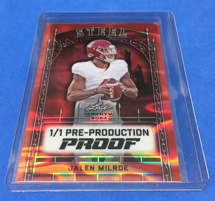The Card: Jalen Milroe 2024 Leaf Trinity Steel Red Lava Autographs pre-production proof (1/1) & Justice Haynes 2025 Pro Set Metal Platinum Autographs Super Prismatic Gold pre-production proof (1/1)