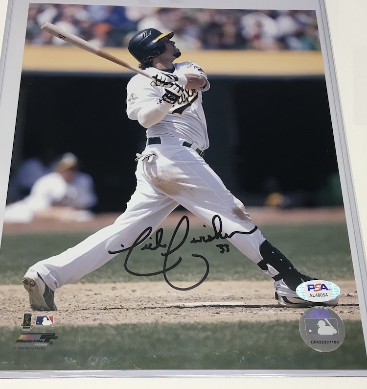 The Items: Nick Swisher autographed Oakland A's 8-by-10 photo (PSA/DNA certified) & 2025 autographed Strauss promotional appearance postcard-sized photo