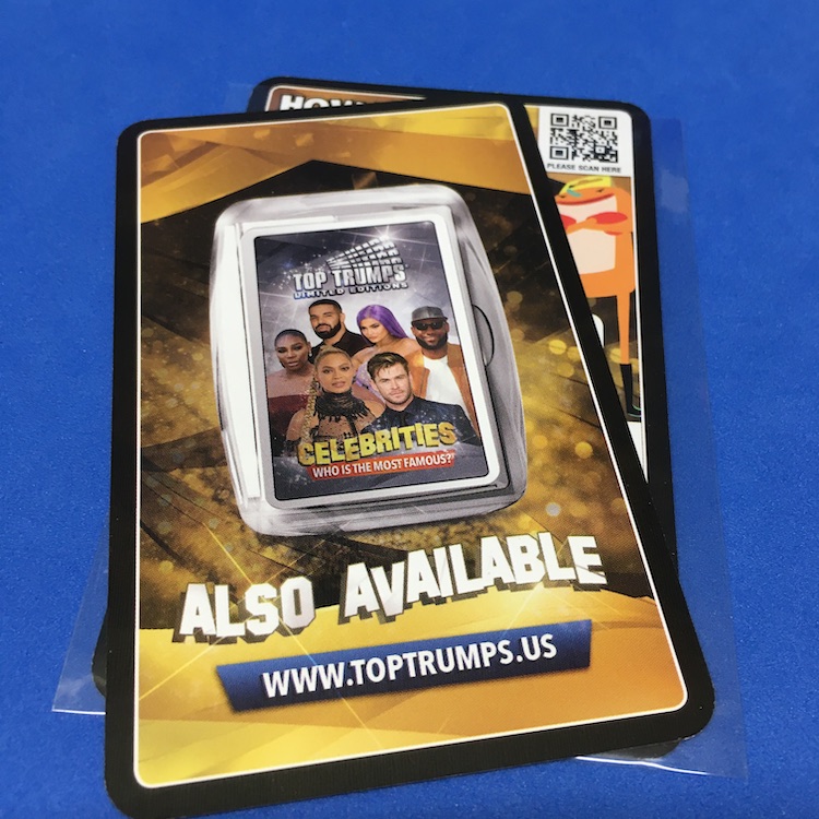 What's Buzz-worthy: This card game brand is one that actually dates back to the late-197os and it was relaunched in the UK in the 1990s where it presents decks like this for a number of varying topics that all play the same way. Does one player's card trump another? If so, the winner gets both cards. But this one isn't really here for the playing side .... there's a lot to collect over the years with sets for movie stars, other celebs, pop stars, films, TV shows and other properties that have signed on for some merch. This celeb catch-all is probably thanks to the UK's publicity rights laws -- I think -- but there are others such as golfers, boxers, soccer stars, etc., that might pack more into these decks than one might expect to find if done elsewhere. With their long-running history and a ton of options available past and present around the world, I won't even try to claim a deep knowledge here ... but this deck finally presented itself, so I bit. Some of these gaming cards have been popular with card-graders and sellers, especially around COVID times, with some names in sets not found on cardboard heavily elsewhere found here. This set? Many of these names, if not all of them, likely have other cards from countless roles that got merch and/or card sets but I liked the price. (Decks are generally around $10-15.) Given the number of cards and names, these also can be a simple break-up/come out ahead option for slow-paced sellers, too. I just like to dabble with different cardboard and these do present some compelling grading options with a matte finish, all that black ink on both sides ... but a slightly taller size where you may not be able to grade them everywhere just yet. The mixing in of a few retro names in this one also helps, though the visuals (remember it's a card game) are a little repetitive. All in all, though, I didn't mind it and will probably grab some different ones at some point if they present themselves. Why? Just for something different.