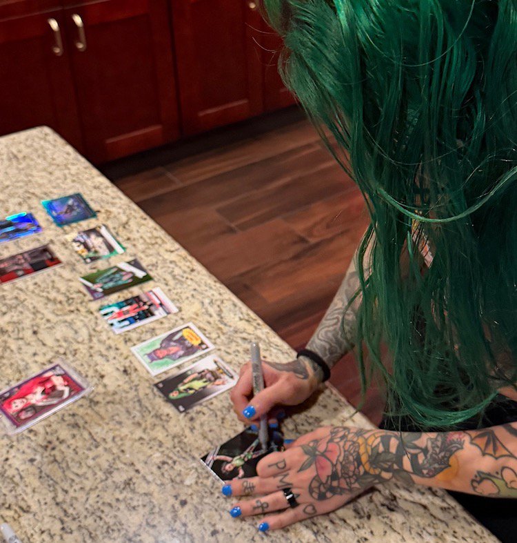 In a later email, we settled on a deal -- a few sets for a few autographs on cards that I'd send to them -- and once I figured out my lineup the wheels were in motion -- no, not her spin the wheel, make a deal kind of wheel that's common this time of year given her horror movie-loving, scream-queen style. (She's, to me, more of a character than just a character but this time of year all of that hits maximum overdrive, including elaborate cosplay homages of some of her on-screen favorites.) I knew that this might not be the easiest thing to pull off this time of year when the already heavy bookings would be maxed out, meaning plenty of October travel for the new Indy God.