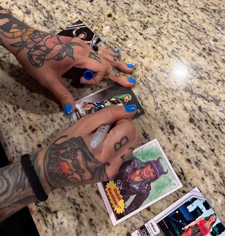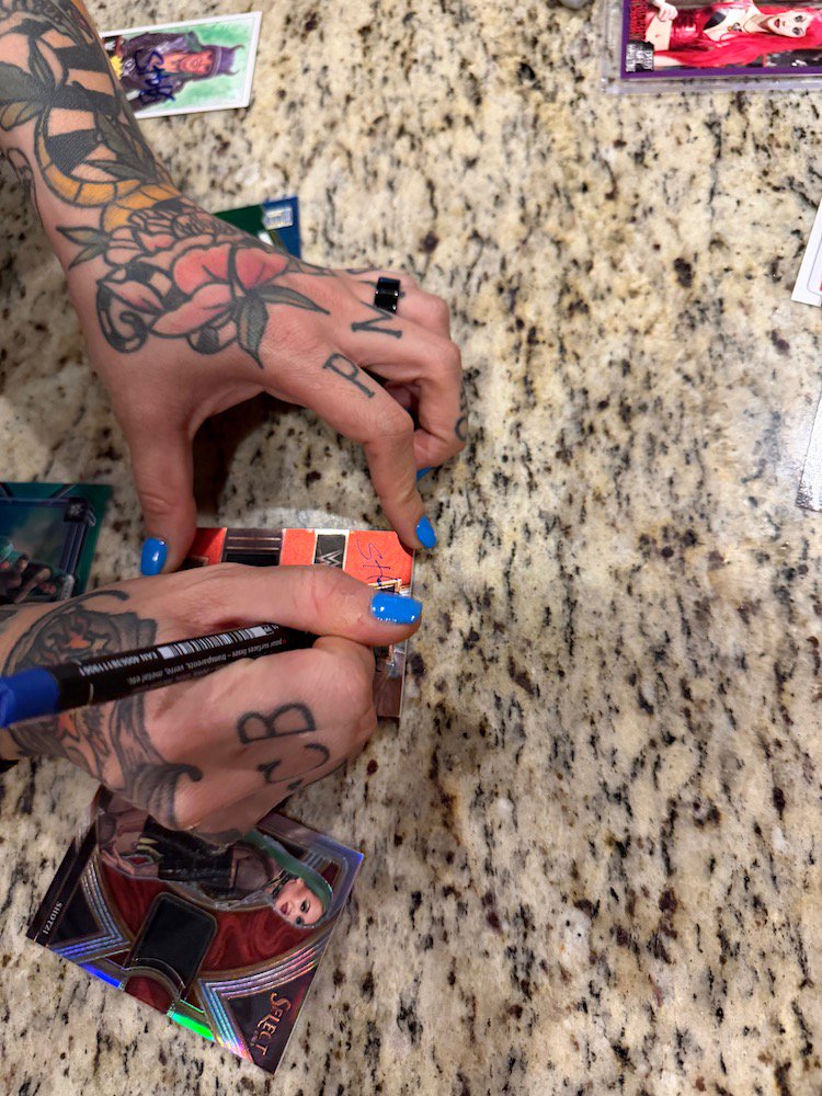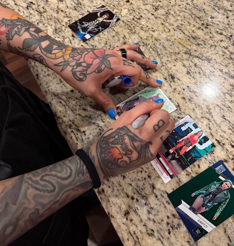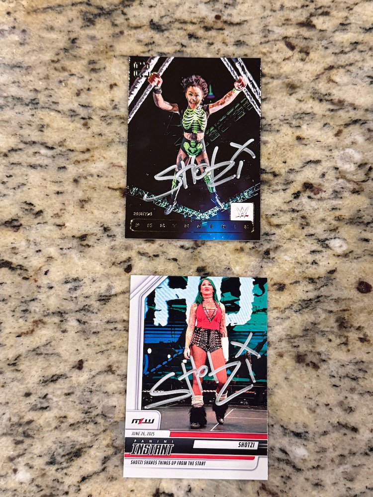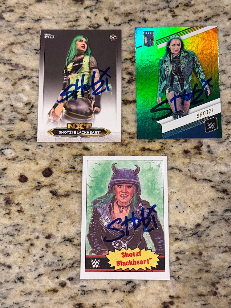 The message was from Shotzi Blackheart's husband, Jesus Alfaro, but he didn't mention that in his message. It was a simple, brief inquiry about if any of my cards could be available late on a Friday night -- one where she had probably just finished a tag match in Rhode Island as one of countless indy appearances since the end of her WWE run earlier this year. Rather than try to figure out a dollar value on my sets -- and despite one collecting friend's initial reaction that said "Get gear!" -- I settled on something simple for everybody, knowing what I'd be giving up has good value but also knowing what I paid for them and knowing that simplicity in my reply could/should lead to a reality. I also knew where the sets would end up and not elsewhere -- and that was cool enough for me. (The story here writes itself ... I'm just getting in the way here telling it.)