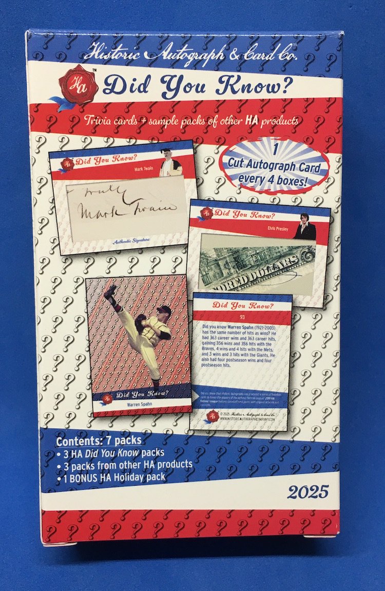 The box: 2025 Historic Autographs Did You Know? trivia cards
