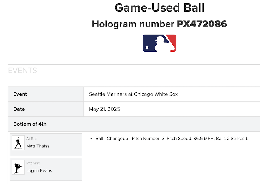 What's Buzz-worthy: My breakdown here is similar to last time as the facts of the game haven't changed. ... The Sox are one of several teams that pre-sells baseballs by date during the season and the listings on their MLB Auctions page stay there as long as the baseballs are in stock. On a hunch, I cross-checked Raleigh's home run log to the team listings and this was the lone Seattle opponent that still had baseballs in stock for a game where Big Dumper went yard in his a record-setting season for a Mariner (better than That Griffey Guy ever did) and for any catcher in MLB history. While Raleigh came up just short of the American League record, I knew I'd want to get a piece of this season just because ... so I rolled the dice. I figured there would be a 50-50 shot -- at worst -- of landing a baseball touched by him during the game with him being a catcher and I figured the home team may not care as much about stuff not hit by, or a highlight for, their squad. In this case, just like last time, it didn't initially register that this could be a Raleigh-used ball (he's not noted on the authentication info) but, yep, he's right there in the video picking this one out of the dirt -- and that same dirt resides on this ball today. In addition to Dumper trivia, this ball is from just the fifth start of Evans' career and he set a career-high (so far as it still stands) with seven strikeouts in a no-decision. For Thaiss, this was his 34th game with the Sox and he only played one more after it as he was traded to the Rays six days later for minor-leaguer Dru Baker. ... The only number that matters in this game for this ball to me, though, is that it's from one of the 60-homer games for Big Dumper -- and I got it at a low price letting me collect other stuff, too.
