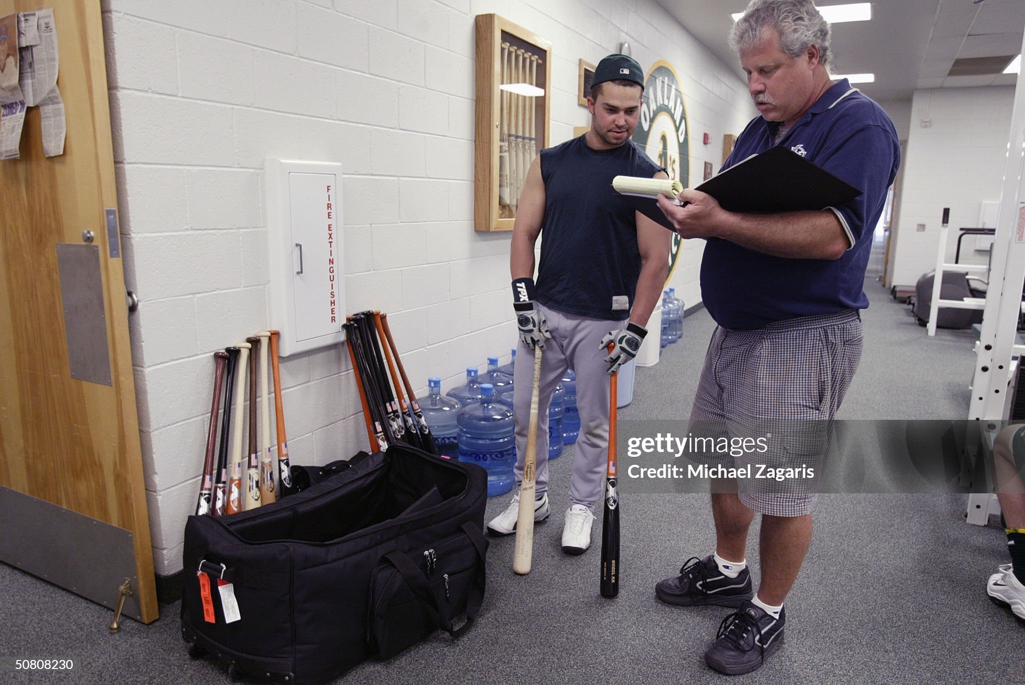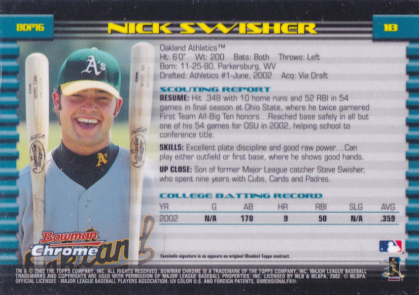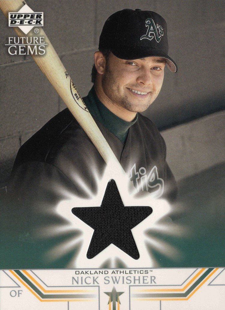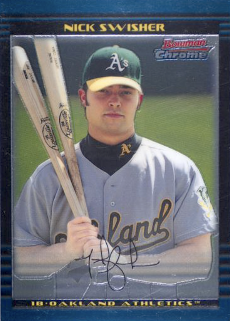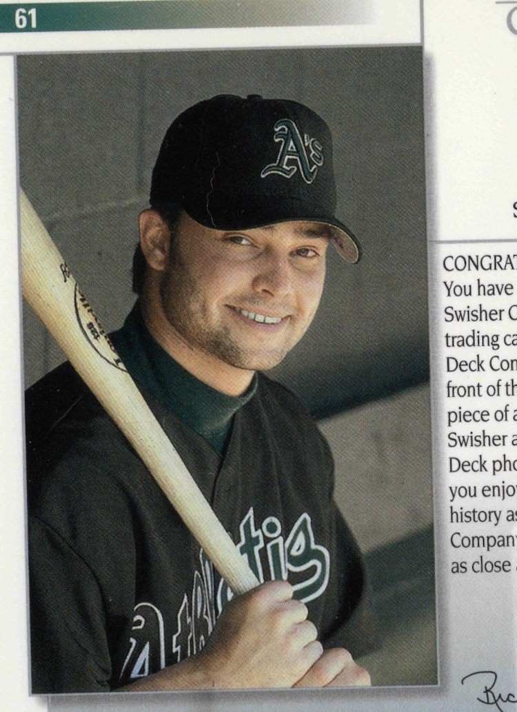 I went to one resource for online photo-matching, the publicly available Getty Images photo site, and above is revealing. In that photo, Swisher is holding a taped name-model P72 as he talked to a bat rep (click for a closer look or hit the gallery below). I doubt he placed an order from that company as he didn’t (based on what I’ve seen) use anything other than Louisville Sluggers until later in his career. The image is from Feb. 27, 2004 -- a day after A’s players reported in Phoenix -- so it’s about as early as it gets for that spring. (Why did Swisher use two colors of bats? At that point in his career the switch-hitter used a natural P72 when batting right-handed and then a colored S348 model when hitting lefty. The difference helped him pick them from the rack quickly.)