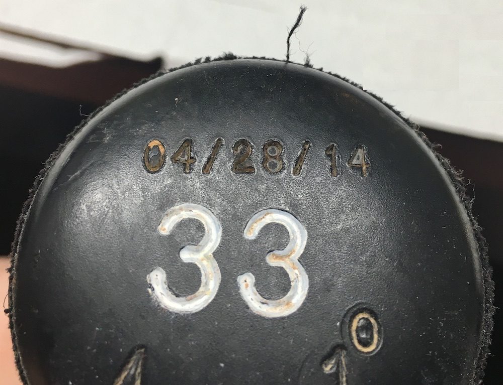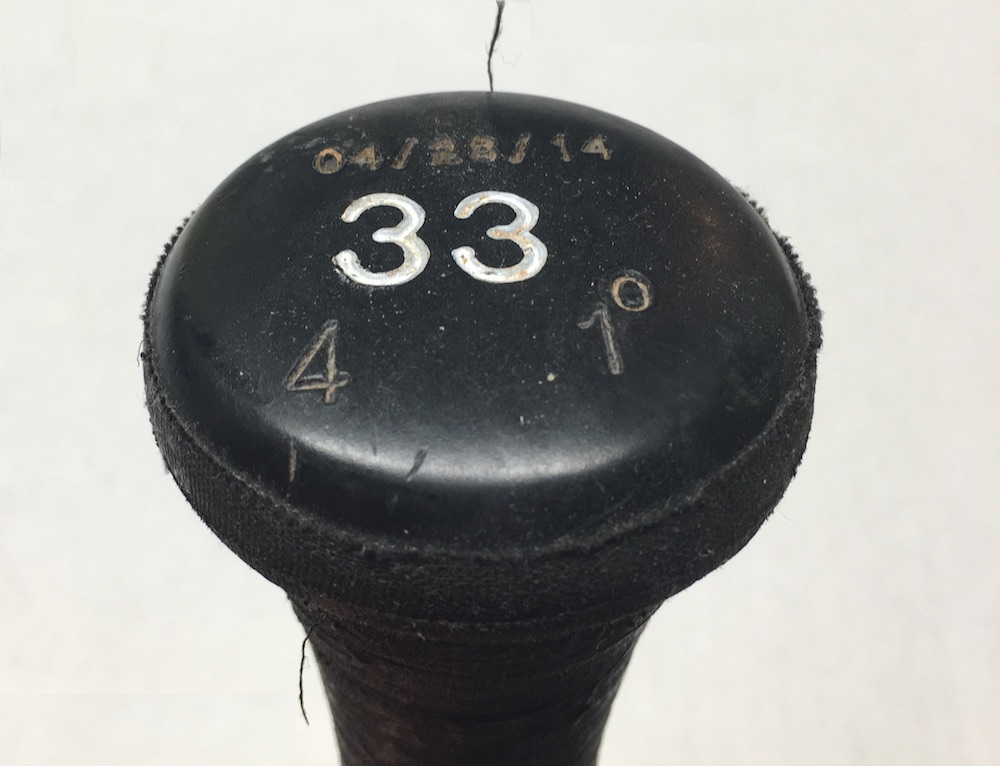 What's Buzz-worthy: I've picked off a ton of bats for my player over the years -- sometimes in more than one piece and sometimes with missing pieces for sure -- but this one is right up there in terms of its oddity as three-fourths of the back of its barrel is lost to history. Whether this break was from a batting practice mishap (based on model and taping it's not likely, though he did try a lot of brands later in his career) or game-use I'll never know ... unless somebody out there has a whole lot of access to full games where every at-bat of his 2014 season after the bat's creation date could be checked -- but even then that might not be conclusive. What's known here? The bat was finished/shipped on April 28, 2014, based on its knob stamping and that would mean it was doing his time with the Cleveland Indians toward the end of his career. I checked all available Getty Images stills from that season and struck out. The MLB Film Room might have had some use if this was a far newer piece but ... nope, too old. When I first found this one awhile back -- at a bargain fraction of what a full-priced bat would run -- I scoured all spots I normally would and struck out. Despite that, and despite this one not having an MLBA sticker, I'm still confident that it's legit with his barrel taping one of the reasons why.