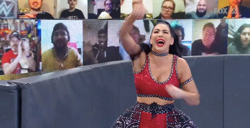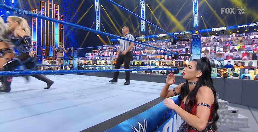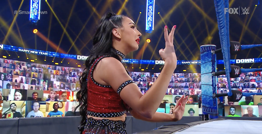 TV-worn gear (direct from McKay): Choker and armbands worn during her antics during a Smackdown match between The Riott Squad (Liv Morgan and Ruby Riott) and Tamina & Natalya on Jan. 1, 2021 -- and during a backstage promo for WWE.com that same night as she continued to sell others on her available wrestling services.