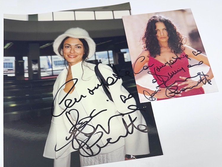 Update: The mystery signer is Maria Grazia Cucinotta, an Italian actress who was a Bond Girl in The World Is Not Enough and has more than 100 credits on her IMDb page. That would explain why everybody I asked didn't know her. Meanwhile, she also had roles in The Sopranos and The Simpsons. She does have certified auto cards thanks to that role while signed photos with asking prices anywhere from $20 to $180 depending on item and documentation. I feel pretty good about these.
