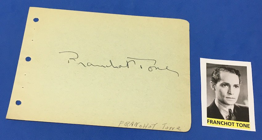 The Buzz: The lots I picked up of this type of autograph were all meticulously detailed in little vinyl holders by a collector/dealer of signatures from long ago with small printed photos paired with the cuts whenever possible. The lot was in the hundreds if not low thousands of signatures with many of them just like this -- stuff from the mid/late 1970s was the newest stuff, while many more were more like this with all kinds of probably now-obscure names who were big deals in the past. I have no doubt that a lot of the signers in the lots are bigger deals to those who are focused on really old Hollywood (unlike me and the seller I got this from). How old is this? Tone, who has a star on the Hollywood Walk of Fame (in 1960), was a leading man in the 1930s and 1940s and worked on Broadway in the late-1920s and early 1930s until he landed an MGM deal and then worked for Universal, Columbia and Paramount. After that, he became a producer and worked in TV before he died in the late-1960s. His first wife was Joan Crawford (his co-star in a few films) and he married three other times -- all actresses who have a wiki page just like him, too. (There's a lot on his résumé for sure.) Among his biggest projects? Mutiny on the Bounty where he was nominated for an Academy Award for Best Actor along with Clark Gable and Charles Laughton. Among his many other co-stars? Bette Davis, Jean Harlow, Katharine Hepburn, Cary Grant, Lionel Barrymore, Gary Cooper, Lucille Ball ... and on and on. I picked off the lot simply because of its age but there are a lot of stories to be found in many of the autos just like this -- and I'm confident seeing other signatures that this one is real. My gut said that there was big potential here beyond $3 an autograph -- and the curiosity factor is even higher for me. It's something different for my collection, which is probably in the low thousands when it comes to my number of sigs. (I've never tried counting but been amassing them for decades.)