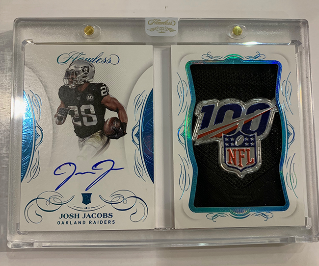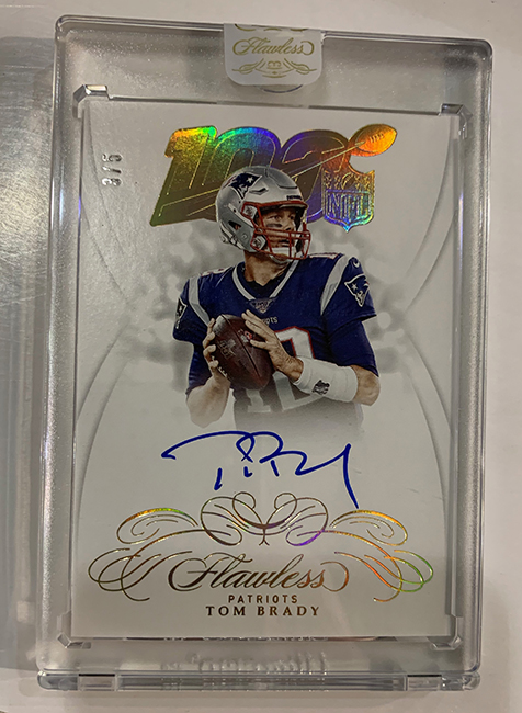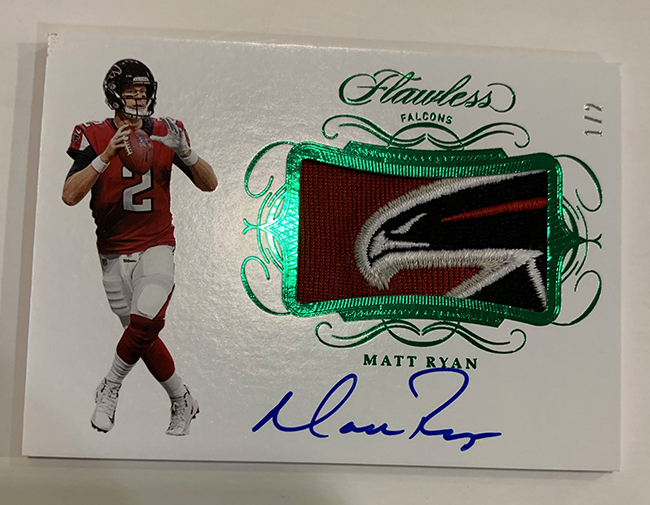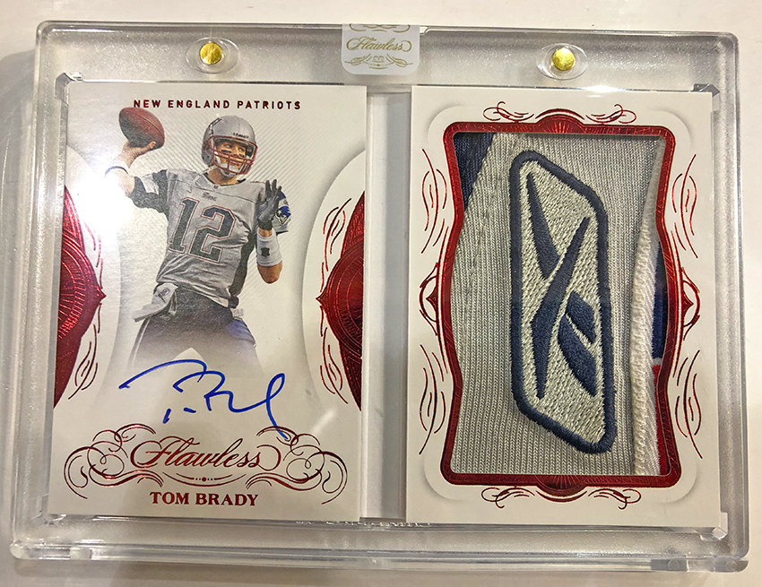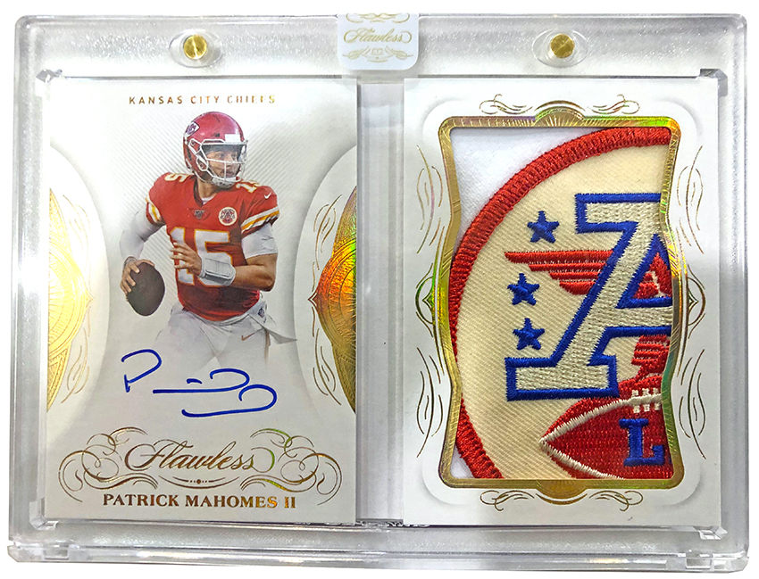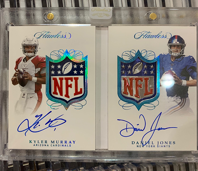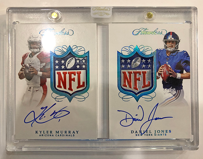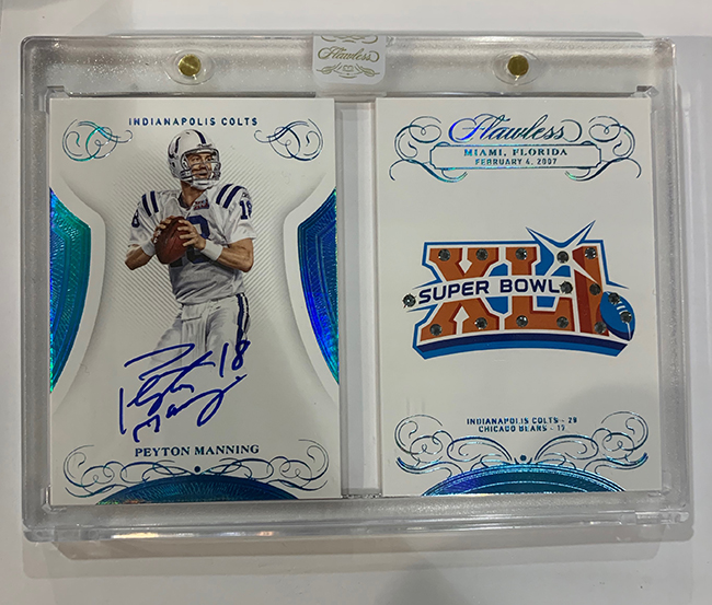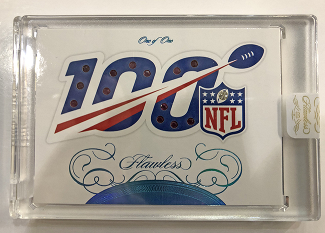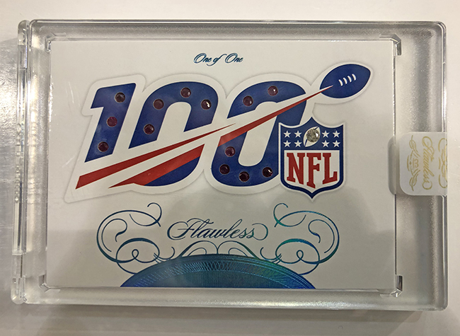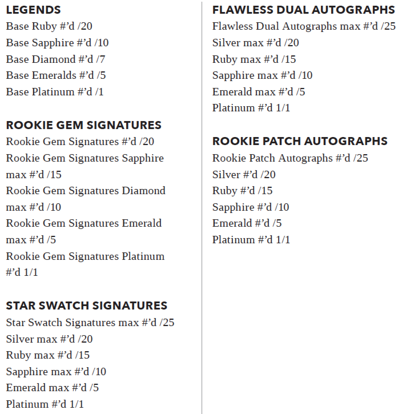 The Basics: Rookie Cards will be autographed gem cards here with the basic versions being limited to just 20 copies. (Nothing in the product will be higher than 25 as usual). You can see the parallel breakdown in the gallery below -- each rookie will have four parallels of their standard card. Legendary players also will appear on gem card starting at just 20 copies apiece (no ink there). For autographed memorabilia cards, there are a number of options here, including Star Swatch Signatures, Rookie Patch Autographs, 1/1 Shield Signatures and others. ... For standard ink, there also will be dual-autographs that will pair past and present players. ... For booklets, there will be Super Bowl Gem cards that pair an autograph on one panel and a second panel with a Super Bowl logo adorned with gems. They will be joined by Veteran books, Rookie books, Signature Gems, Flawless Duals and Super Bowl Gems. ... Among the new inclusions here will be Rookie Showcase memorabilia cards, Super Bowl Swatches, Rookie Cleat autos, Flawless Spikes, Flawless Dual autos, Flawless Finishes, Rookie Shadow Signatures, NFL 100 Autographs Collection and some other surprises. ... The boxes carry an increased suggested retail price of $1,350.