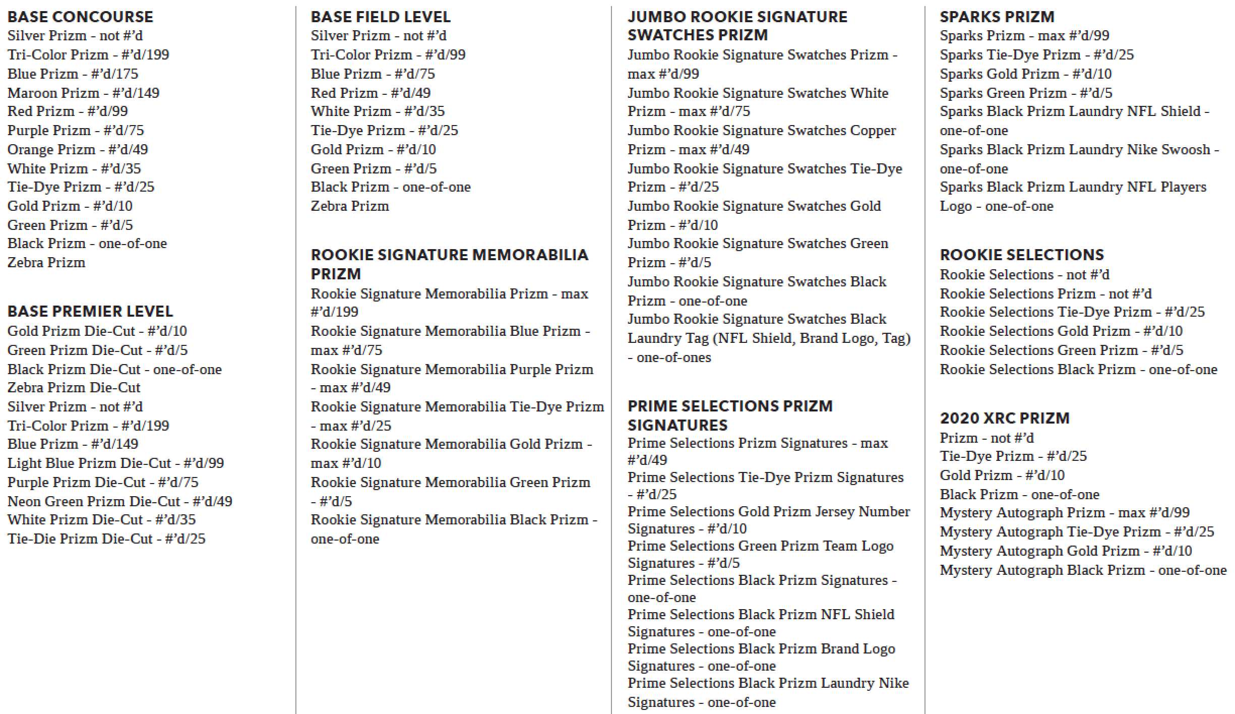 The Basics: Boxes will include 15 Prizms with at least five of those serial-numbered as well as six insert cards, 24 Concourse cards, 10 Premier Level cards and two Field Level cards. The 2020 XRCs will be found in every fourth box or three times per case -- and there will be XRC autograph cards to be found, too. ... Among the auto cards are Rookie Signature Memorabilia, Jumbo Rookie Signature Swatches and Prime Selections Prizm Signatures, while memorabilia sets will be Jumbo Rookie Swatch, Sparks, Select Swatches, Draft Selections Memorabilia and Rookie Swatches. ... The parallel lineups can be seen for everything in the gallery below with new looks for the basics including Concourse Red, Concourse Purple, Premier Level Blue, Premier Level White, Field Level Blue and Field Level White. ... Among the insert cards will be Phenomenon, Snapshots, Sensations and Rookie Selections. ... Boxes will carry a suggested retail price of $150 for this year.