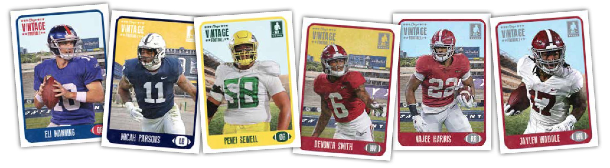 The Basics: There will be top picks in the 2021 NFL Draft to be found here along with two-time Super Bowl champ Eli Manning and the reigning Rookie of the Year Justin Herbert. In the mix will be inscribed and numbered variation autographs as well as a redemption for an autographed helmet of this year's No. 1 overall pick. Among the names teased -- see the full list in the gallery -- are Mac Jones, Jaylen Waddle, DeVonta Smith, Najee Harris, Patrick Surtain, Zach Wilson, Justin Fields, Trey Lance, Penei Sewell, Travis Etienne, Kyle Pitts and Micah Parsons for starters. Autographs will be found with Blue ink (/400 max), Green ink (/50 max), Red ink (/25 max) and Black ink (/5). ... Just 650 cases will be made.