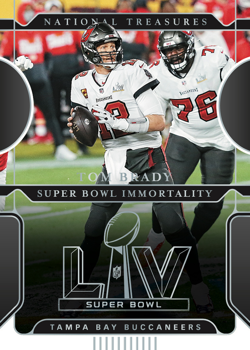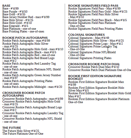 The Basics: This one will include a number of autographed cards in its lineup with rookie patch autos (/99 max), "crossover" RPAs, The Future acetate autos (/25) and Field Pass ink all in the mix (parallels and more noted below). ... "Most boxes will deliver extra auto and mem cards," according to Panini, with the minimum being six. They also will have one base card or insert and one parallel (or insert parallel) with the base set being 100 cards. Joining them will be Super Bowl Immortality short-printed inserts as well as other hits -- Colossal Signatures, Crossover dual RPA books, rookie first edition signature books, National Archives autos, Signature Treasury, Heirlooms, Framed Fabric and Treasured Rookies. ... Another rare inclusion? Treasure Chest cards which will have 12 autos (/5). ... Boxes will carry a suggested retail price of $1,000.
