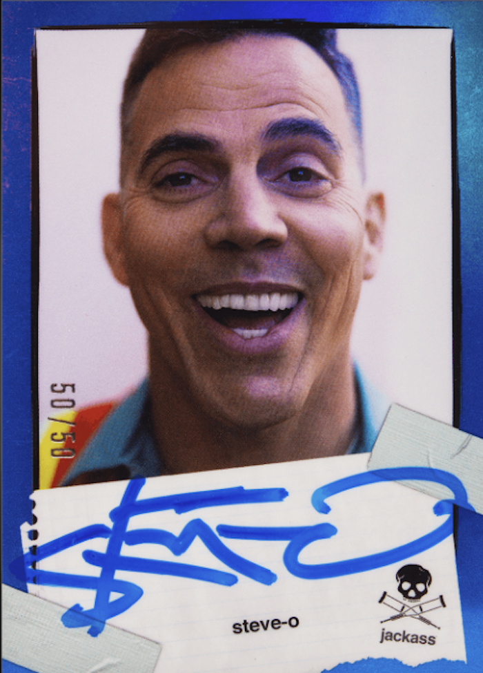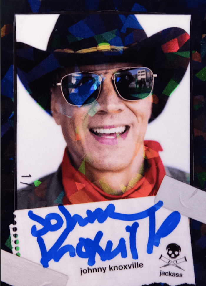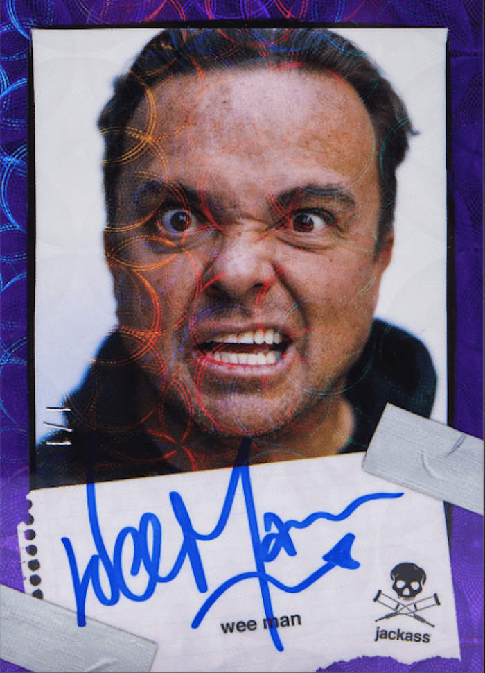 The Basics: The base set of this one will include 50 cards with each having eight parallels -- Silver (/250), Holo (/100), Blue (/50), Red (/25), Gold (/10), Player (/5) and two 1/1 versions ... Black Ice and Card Zero. Some cards in the set will be SPs with those only having Silver and Card Zero parallels. Subsets in the main set include rookies, legends, cameos and group shots as you can see on the checklist above. ... Among the inserts will be Behind The Lens (30 cards) with all parallels save for Silver and those will be joined by Stunts (70 cards) and Movie Posters (10 cards). The autograph lineup will include at least 30 signers with all having parallels (but no Silver). Among them will be Johnny Knoxville, Chris Pontius, Steve-O and Weeman along with other rookies and legends you can see on the checklist. There also will be cameo autograph cards from NHL star PK Subban, UFC champ Francis Ngannou, skating icon Tony Hawk, comedian Eric Andre, boxer Butterbean and Olympic softball star Danielle O’Toole for starters. You can see the full lineup here and a sampling below. ... Only 1,250 cases will be made (10,000 boxes) with only 9,500 of those (1,187.5 cases) released publicly, according to the company. Based on the run announcement, only 2,880 copies of each base card will be made and the other stats should be able to break down based on odds noted with the checklist. ... Packaging here also will have variations with a 1/1 Cracked Ice box in the run along with Gold (/10), Black (/50), Rainbow (/50; cast, crew and promo only), Purple (/890), Green (/1,490), Red (/2,480) and Silver (/4,979).