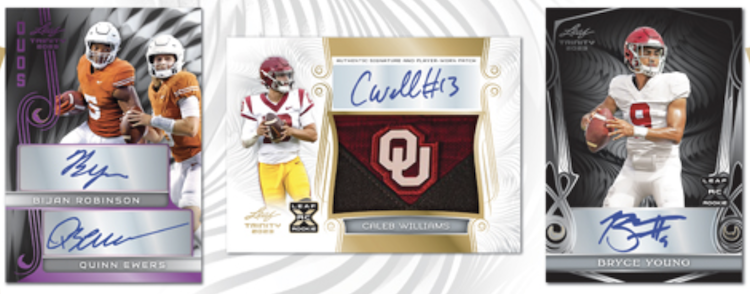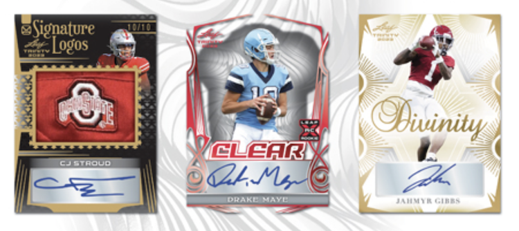 The Basics: These will include nothing but autographs with with Signatures cards, patch autos and Clear Signatures in its boxes. There will be parallels in this one with a few hues seen here among the mocks but no details were revealed. Also in the mix this time will be Duos dual autos and 1/1 Signature Logos and Divinity cards. Among the teased names are Bijan Robinson, Bryce Young, C.J. Stroud, Caleb Williams, Drake Maye, Jahmyr Gibbs and Quinn Ewers.