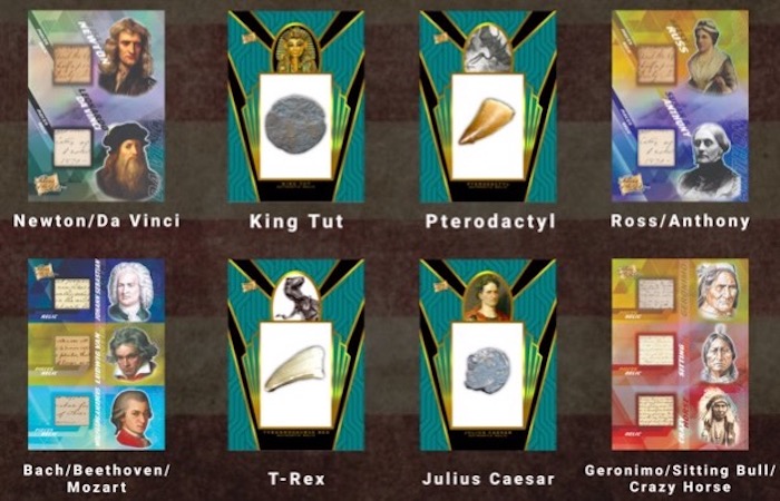 The Basics: More than 100 subjects will be found here. Some memorabilia cards will feature jumbo pieces or multiple subjects with "the most unique jumbo, dual, and triple relic combinations" including the likes of presidents (Washington, Jefferson, Lincoln), painters (Van Gogh, Da Vinci, Rembrandt), musicians (Mozart, Beethoven, Bach), icons (Rockefeller, Carnegie, Galilei) and pirates (Blackbeard, Henry Morgan, Bonny). Also in play? Coin cards, document cards, teeth cards and fossil cards along with cut autographs. The checklist of subjects can be seen below. ... Ten-box cases carry a suggested retail price of $649.