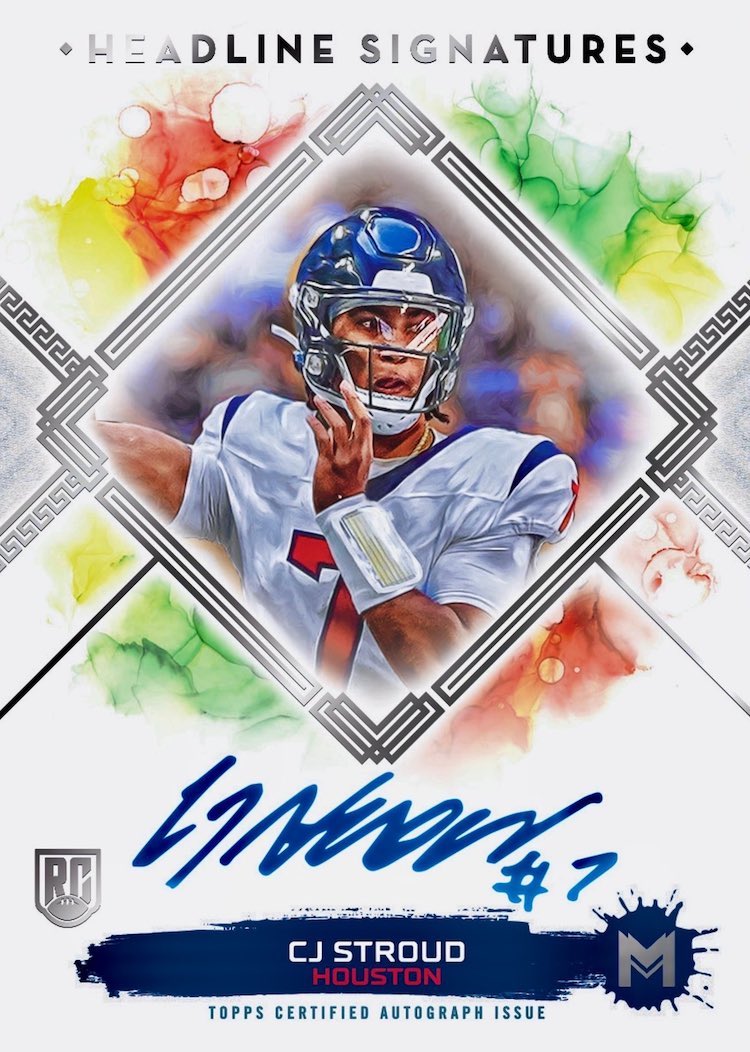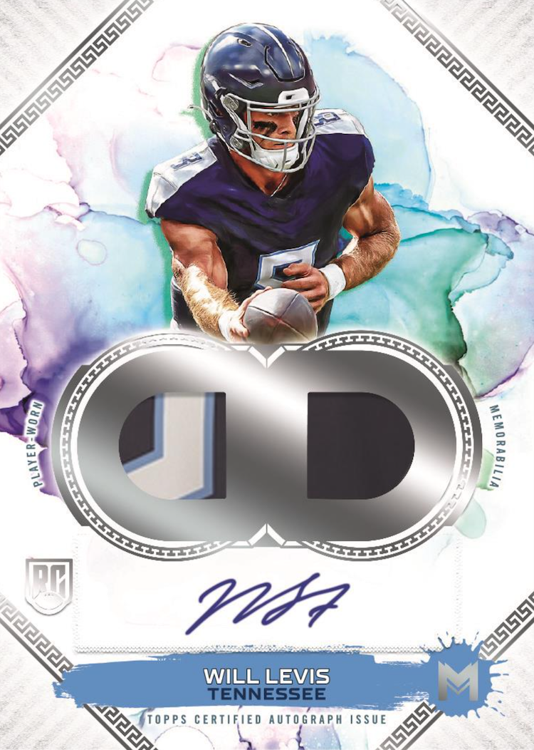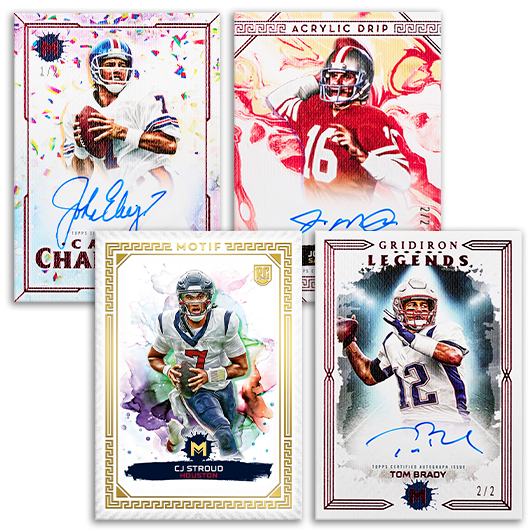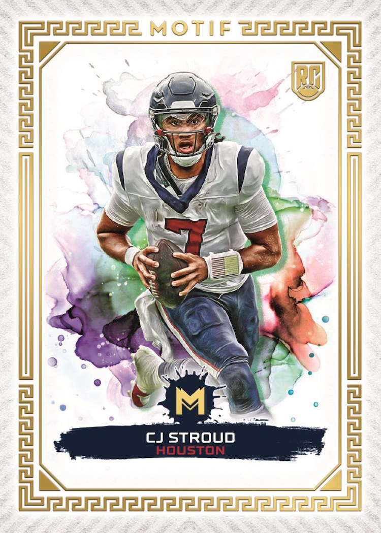 The Basics: Top rookie QBs and stars from the past guide the way here with a base set where every card has five parallels and then a set of 1/1 printing plates. The lineup includes Blue (/20), Orange (/10), Green (/8), Scarlet (/5) and 1/1 Gold. ... There are 10 autograph sets to chase in this one and all will have that same parallel lineup. They include Aquarelle, Virtuoso, Headline Signatures, Acrylic Drip, Motif Endorsements, Gallery, Canvas Champions, Gridiron Legends, Gridiron Legends Duals and Gridiron Legends Triples. The last two will only have Gold and Scarlet parallels. Joining them will be Motif Cut autos. ... There also will be four autographed relic sets in this one with multi-piece cards in play and parallels based on the materials inside the card. There will be rookie relic auto jerseys, rookie relic auto dual patches, rookie relic auto triple patches and rookie relic auto quad patches. Each of these will have Jersey (/99), Helmet (/49), Football (/35), Cleat (/25), Glove (/15), Team Logo (/10), Laundry Tag (/5) and 1/1 Shield parallels.
