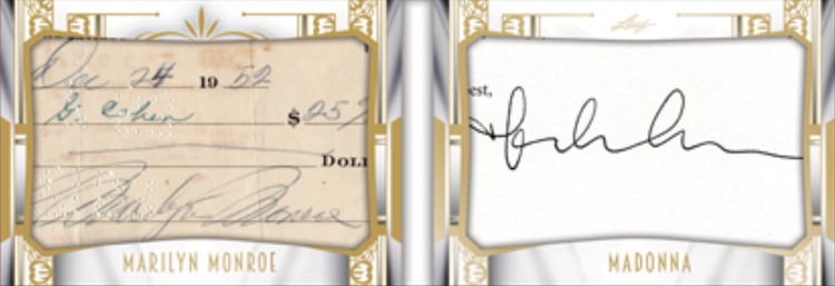 The Basics: Each box here includes 15 base cards, one pearl or diamond and then one of the following -- a hair strand card, a memorabilia card or a cut autograph. A number of inclusions were teased for this one, icluding Rare Material Girl cards among the memorabilia finds, Leaf Metal cards (with parallels but not detailed) and cut auto booklets paired with a kiss print and autos from baseball icon Joe DiMaggio (they were married for nine months in 1954) and music icon Madonna.