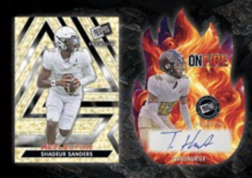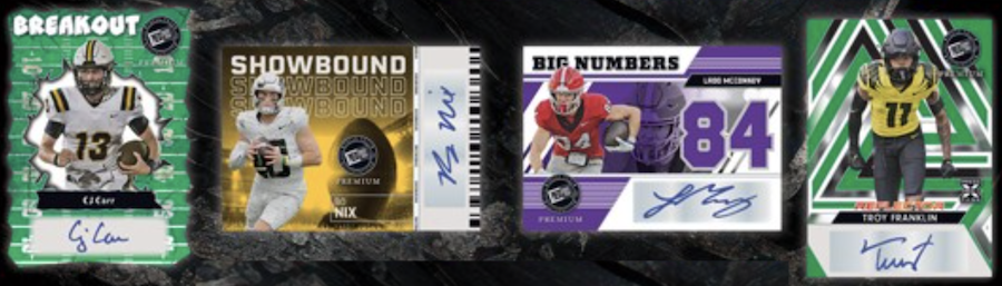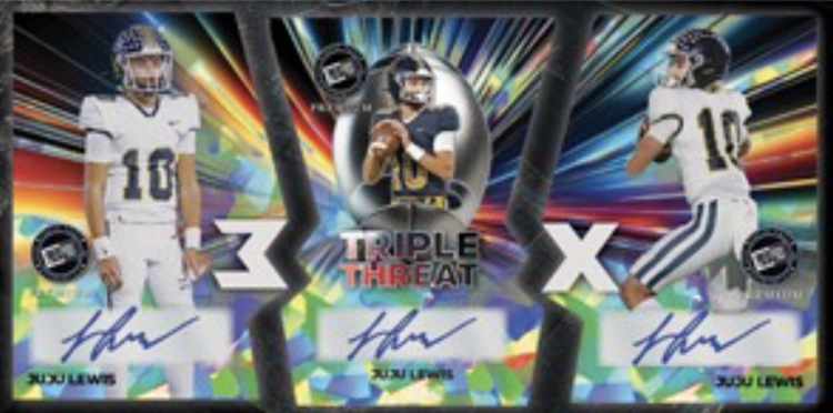 The Basics: According to Leaf, each box will include some popular inserts of the past as well as die-cut cards and plenty of parallels, too. A typical box will include four base cards, two parallels (/35 max), four autos or "retro autograph" cards (/99 max) and then one insert or die-cut auto (/25 max). Among the finds will be Triple Threat three-piece puzzles, Breakout, Showbound, Big Numbers, Golden Arm, Kick-off, Trophy Case, Reflectors and On Fire for starters. Some of the signers here include Juju Lewis, Bo Nix, Jayden Daniels, D.J. Lagway, Shedeur Sanders and Travis Hunter.