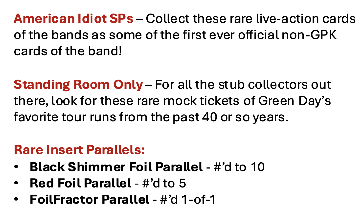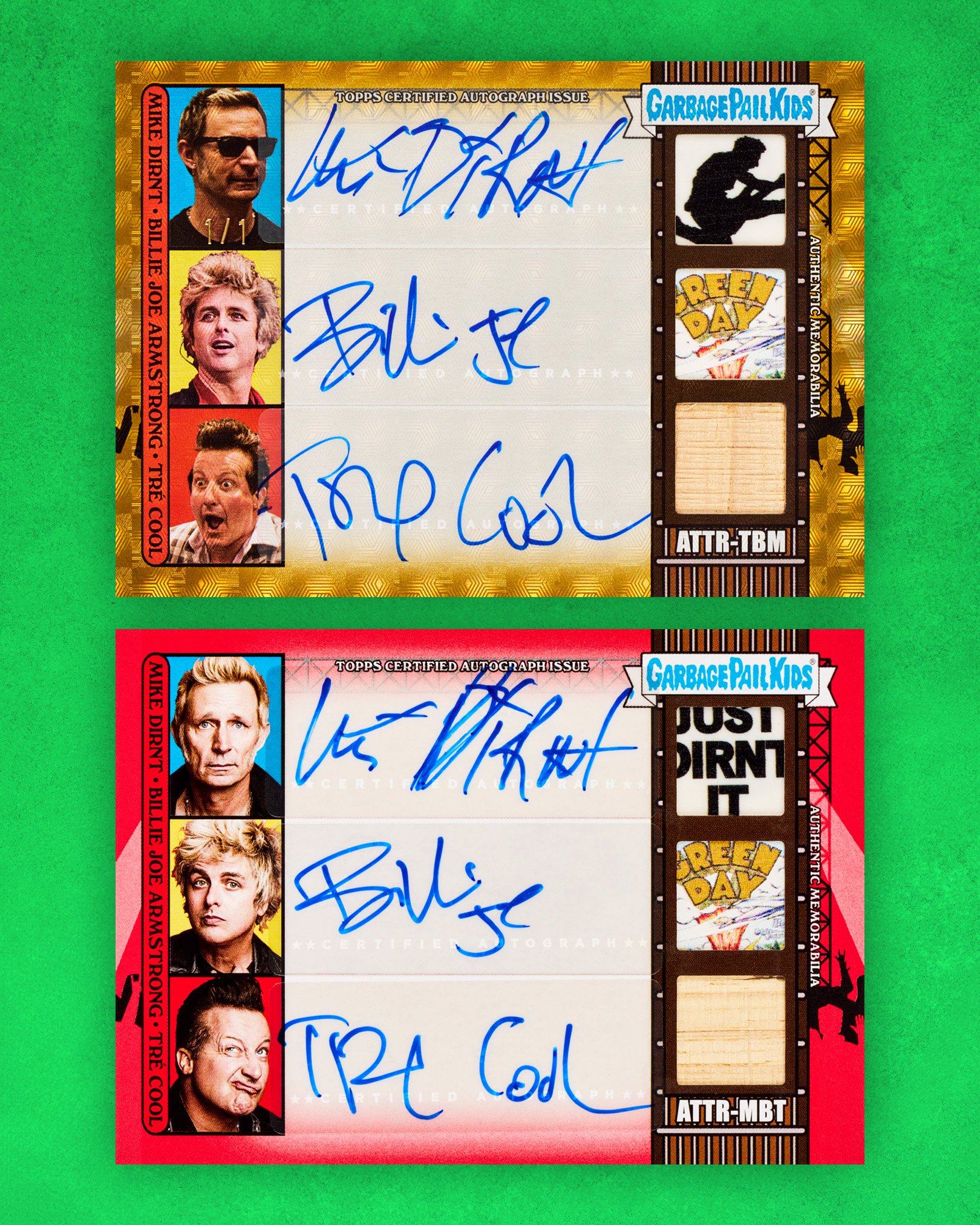Update: Full parallel details are in and are in the gallery below. Triple autos are limited to 25 copies, while American Idiot triple autos are /5. Relics will include picks, guitar strings, drumsticks and drum heads. Autos and Relics also will have 1/1 Foilfractor parallels for all six types of cards.