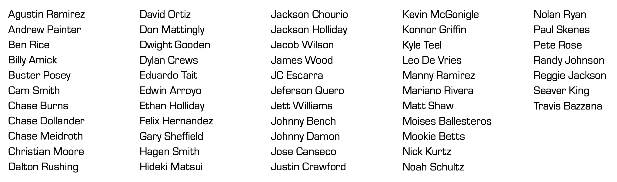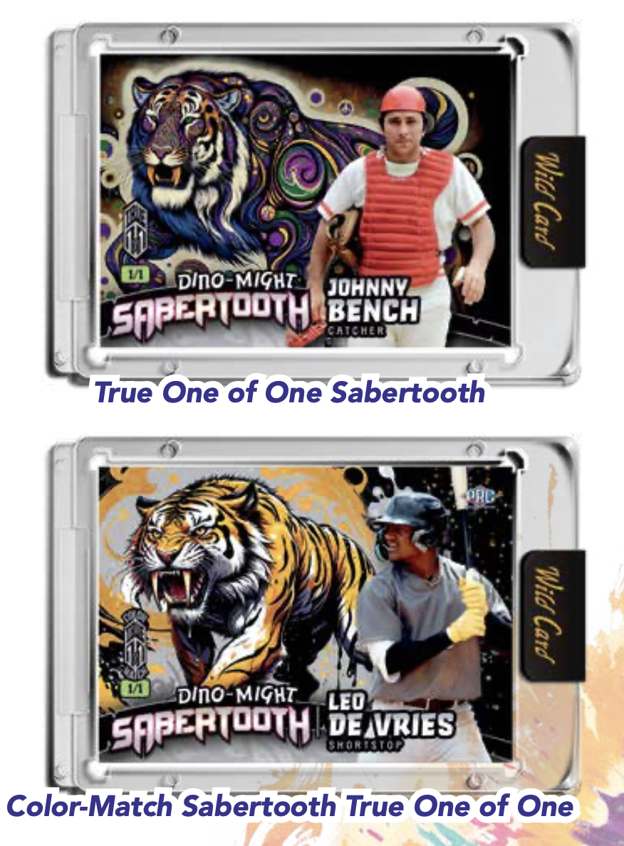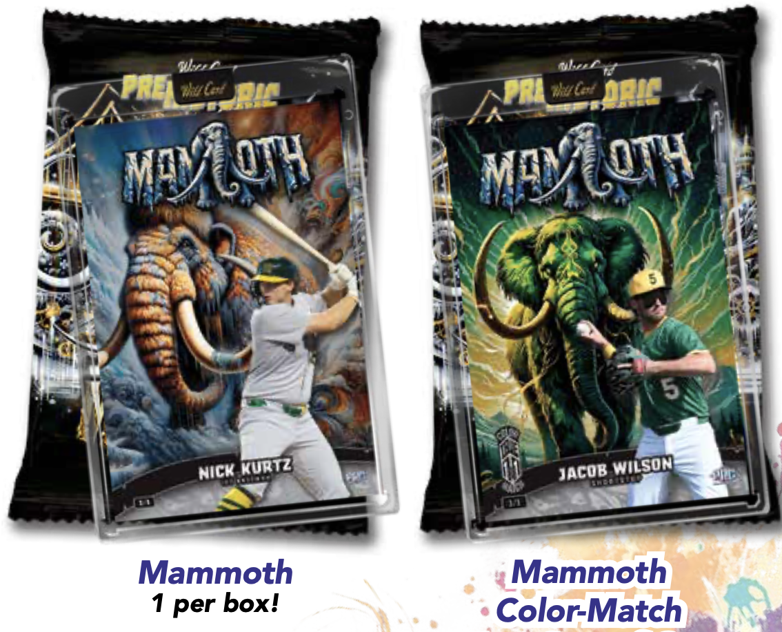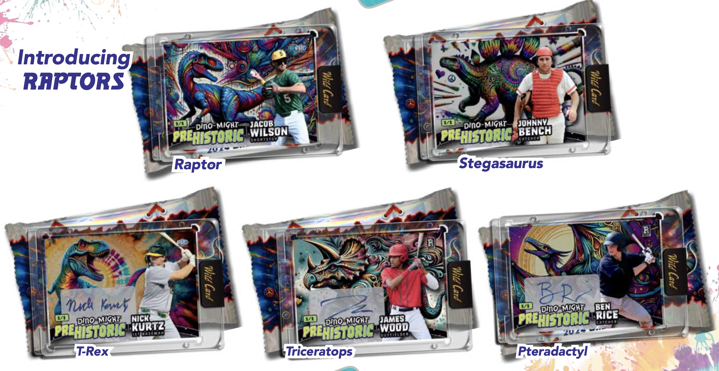 The Basics: Each box includes five cards -- four encased and wrapped standard cards and one encased wrapped 4-by-6 Mammoth card (/5 max) -- with autos in every other box. All cards are serial-numbered to no more than 25 copies in this one. ... Among the finds will be Dino, True 1/1 Sabertooth, Sabertooth 1/1 Color Match, and 1/1 Mammoth Color Match cards found one in every five cases. Sabertooth cards will be two per case as will be Gold Dino and Mammoth cards, while more-standard cards will include Raptors, Stegosaurus, T-Rex, Triceratops and Pterodactyl. ... Chase sets also have autographed versions. ... Among the notables in this one are Paul Skenes, Nolan Ryan, Buster Posey, David Ortiz, Don Mattingly, Dylan Crews, Hideki Matsui, Jacob Wilson, James Wood, Johnny Bench, Mariano Rivera, Mookie Betts, Randy Johnson and Nick Kurtz.