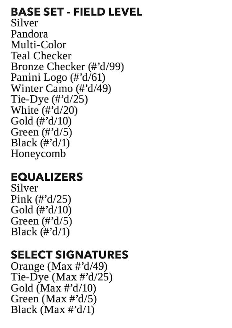The Basics: Boxes will include seven inserts, nine un-numbered parallels and five serial-numbered parallels atop the base and hits in a 60-card box just like previous releases. ... The 250-card base set once again has three tiers like most Select releases with Terrace, Mezzanine and Field Level with parallel rainbows detailed in the gallery. ... Among the hits will be Select Stars, Select Signatures, Select Few Signatures, Pitchside Signatures and Select Pairings autos. ... Among inserts will be Equalizers, Select Future, Unstoppable and Snapshots. ... On the case level, will be "super-rare" Stained Glass, Artistic Impressions, Visionary and Team Badges -- all one per case on average. ... Boxes once again carry a suggested retail price of $300.