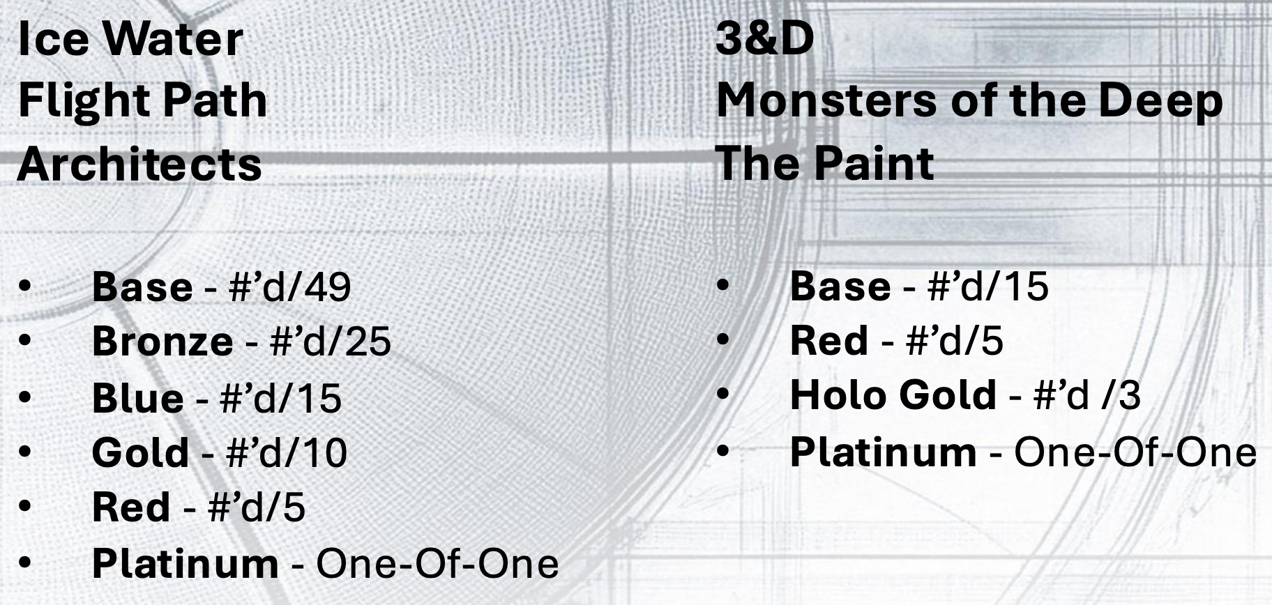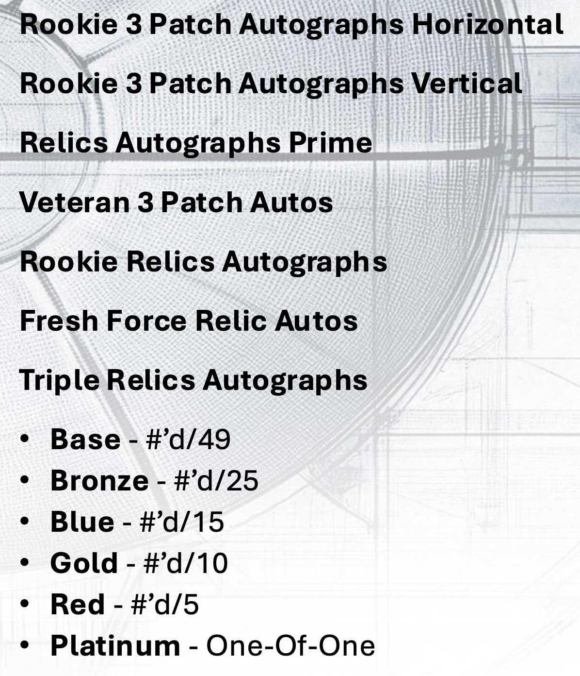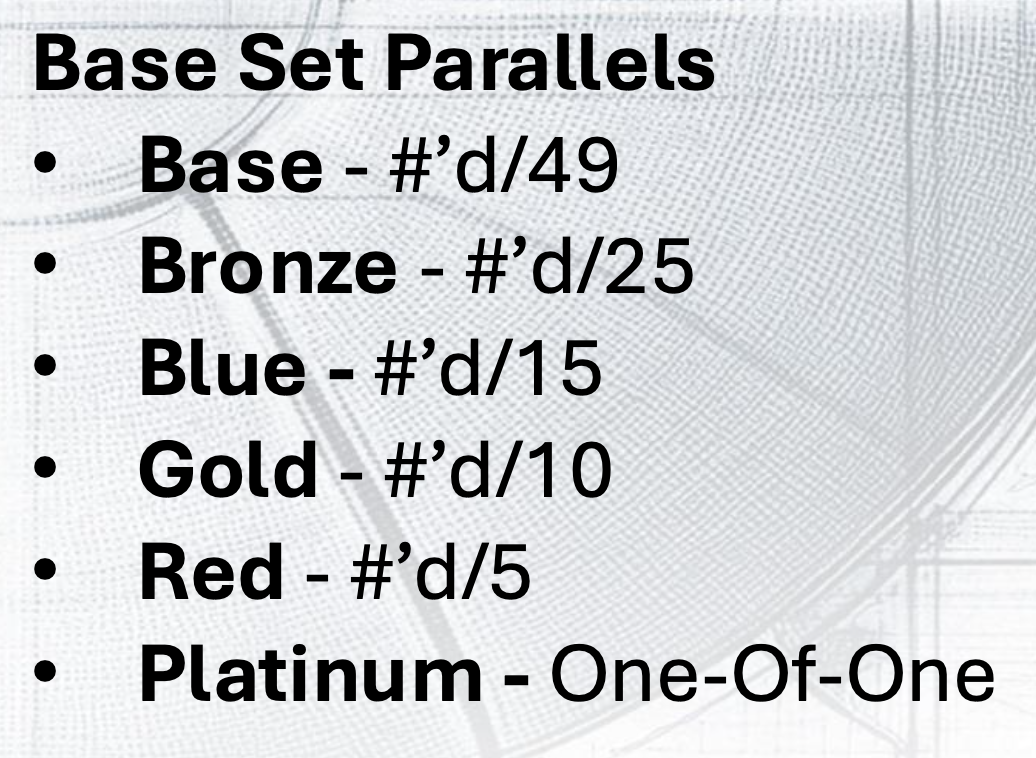 Update: The full lineup of inclusions and parallels has been added to the gallery below. The base set (/49) will consist of 100 cards with five parallels, while three inserts sets will carry the same lineup and volumes. Three other insert sets will be rarer starting at just /15 and having only three parallel versions. ... For hits, there will be seven auto-mem sets starting at /49 with five parallels there, too. The lineup of autograph-only sets is the deepest here with everything /49 and the standard five parallels. The Rim Reapers, Quest For Glory and City Drip sets will start at just 10 copies per card.