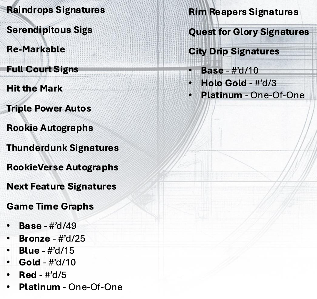 The Basics: The full details are still to come -- this one will update -- but among the signed sets here are Rookie-Verse autos, Thunder Dunks autos, Prime RPAs, Raindrops Signatures, Hit The Mark and more. ... Among the autos will be Rim Reapers, Quest for Glory and City Drip Signatures, "showcasing top talent with dynamic, contemporary designs." ... Among inserts will one 3 & D, Monsters of the Deep and The Paint with "each bringing a distinct visual identity to the product."