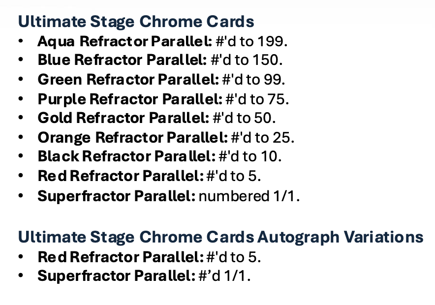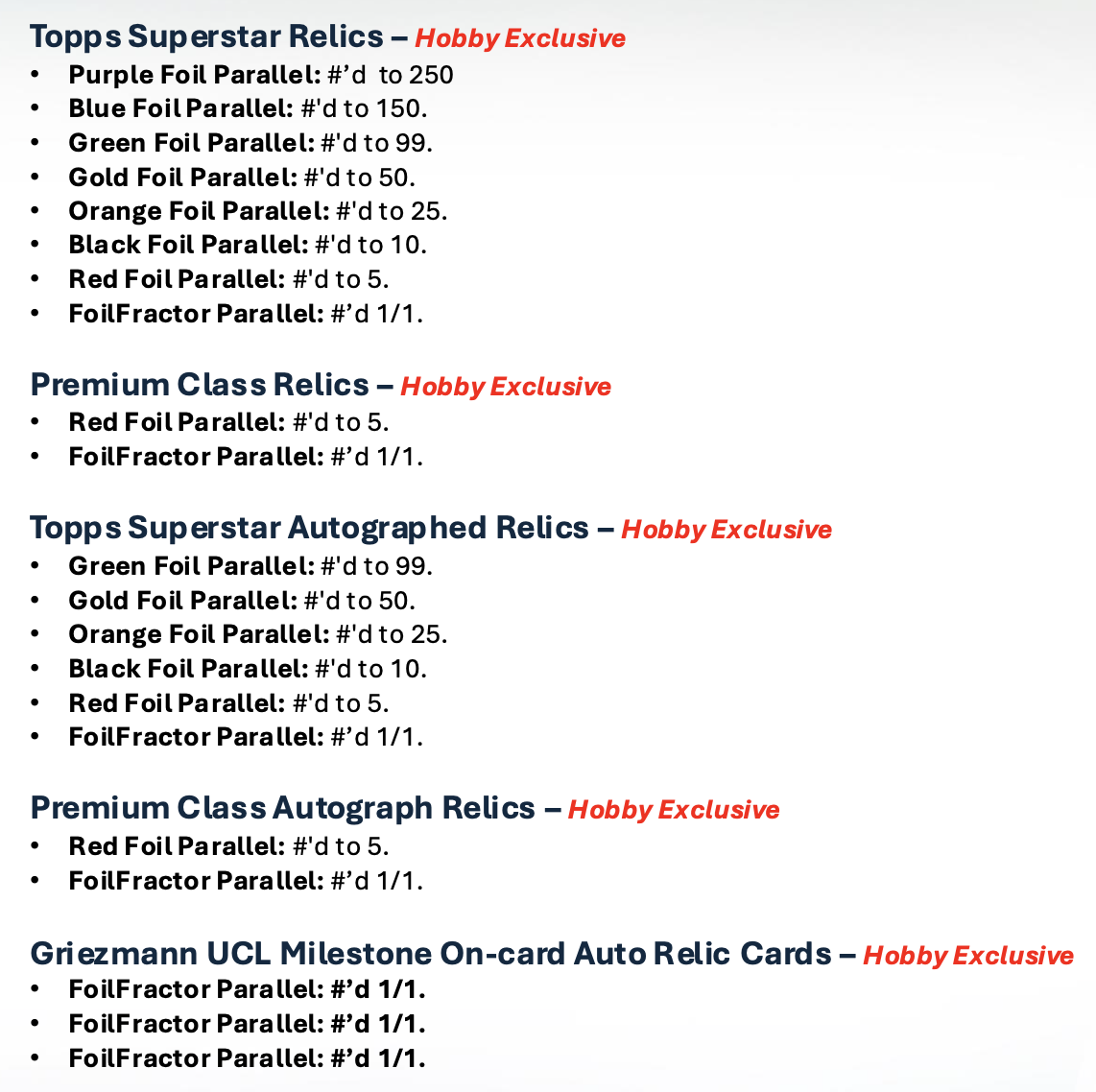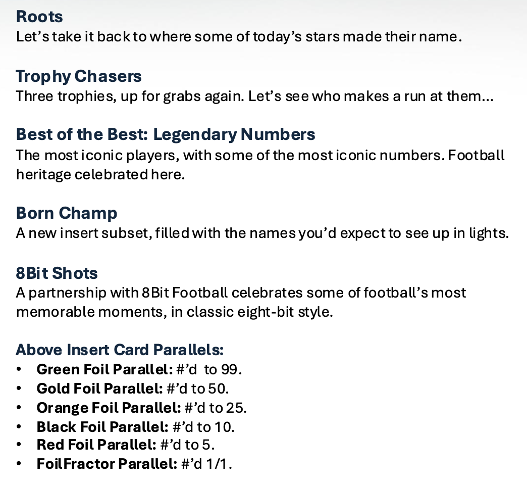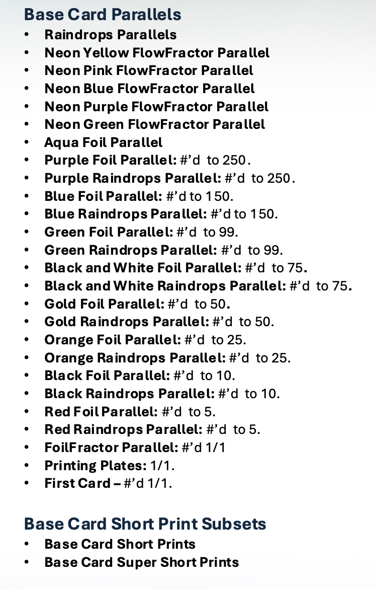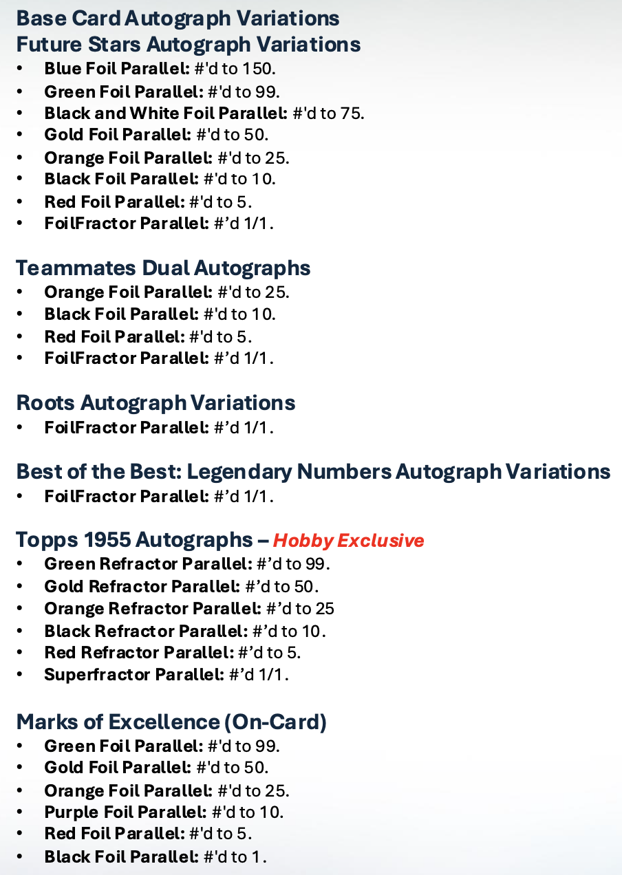 The Basics: A typical box here will include two Flowfractor parallels, six Raindrop parallels, three serial-numbered parallels, the hit and then base along with one Hobby Promo Pack box-topper. Auto Relics will be at least one per case, while Marks of Excellence, 1955 autos, Best of the Best Legendary Numbers ink also will be in play. ... The base set once again will be 200 cards, while insert sets will include Murals, Home Advantage, Mindgames, Roots, Born Champ, 8Bit Ballers and The Grail.
