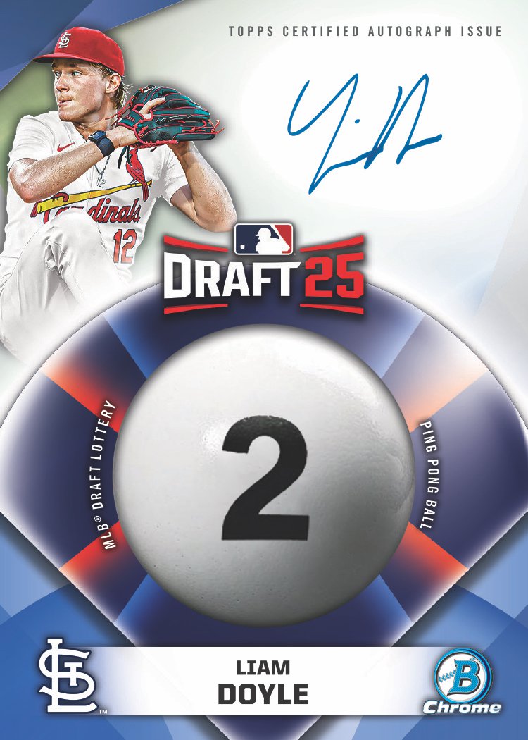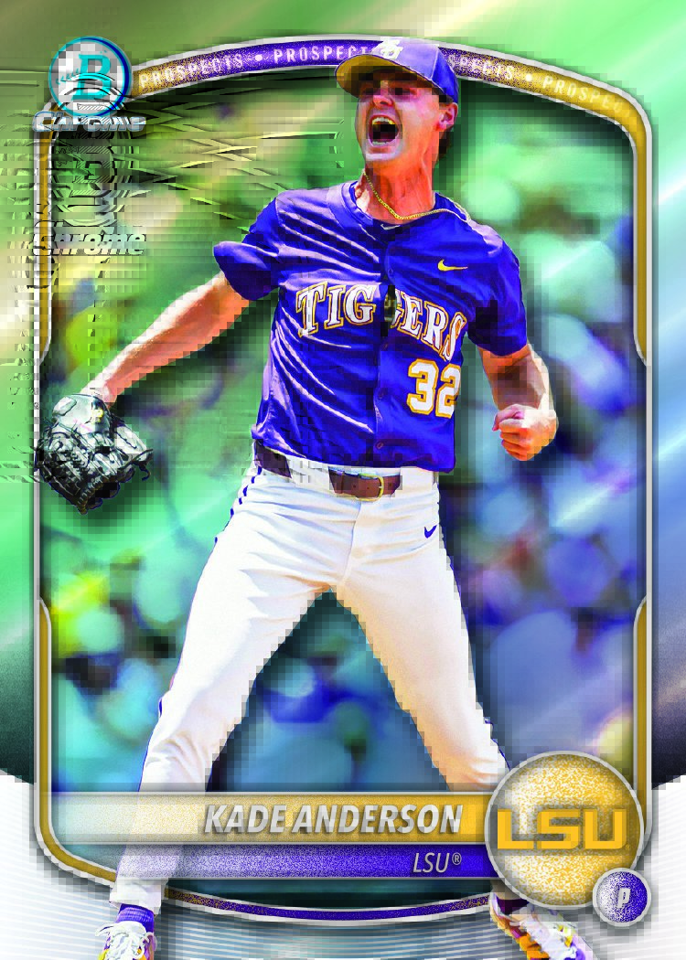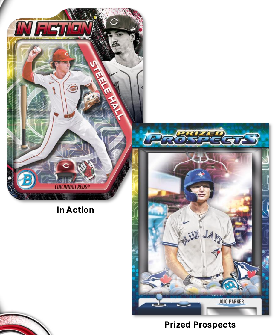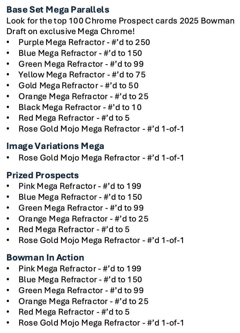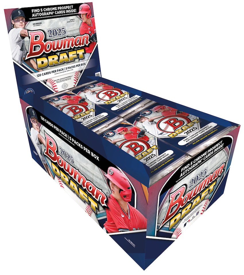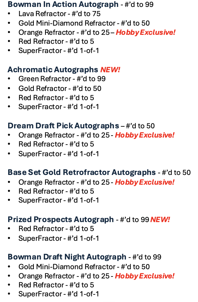 Update: Preliminary checklist added up top. Among the inclusions are Etched In Glass, Final Draft, College Variations, Prized Prospects, Axis, Bowman In Action and Draft Night. Also in there will be a Dream Draft Pick card set that "imagines a legendary athlete, originally drafted by an MLB team, in an alternate baseball timeline." ... Also in there for autos will be Gold Ink variations, duals and Achromatic Autographs "that bring fresh design innovation to Bowman’s signature style." ... Bowman Variety Packs will "add playful refractor patterns like Gum Ball, Sunflower Seeds and Pop Corn Chrome cards," while a Bowman Draft Mega Box will include Laser Refractors and Mega Autographs.