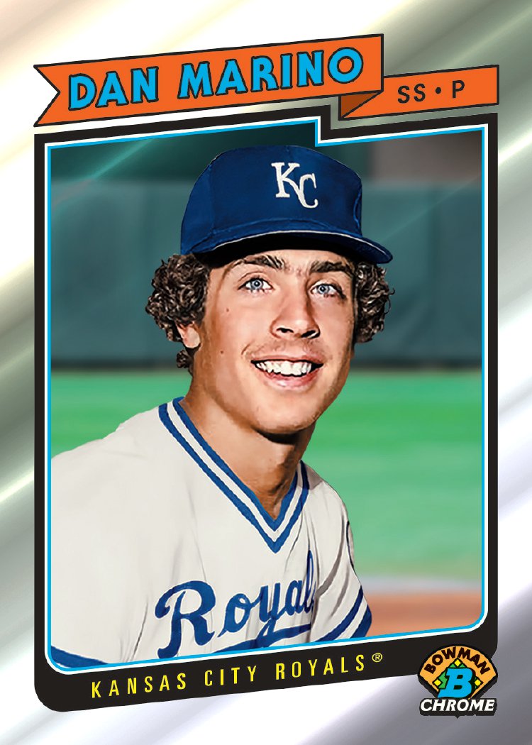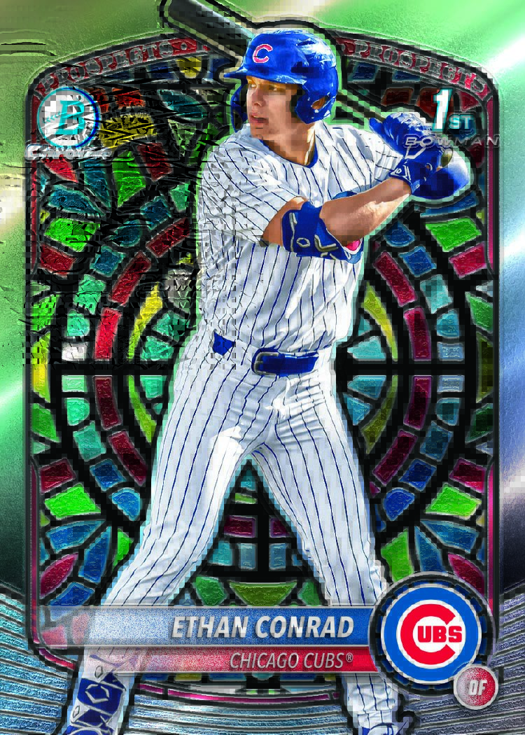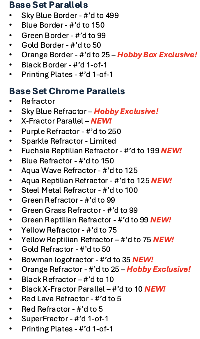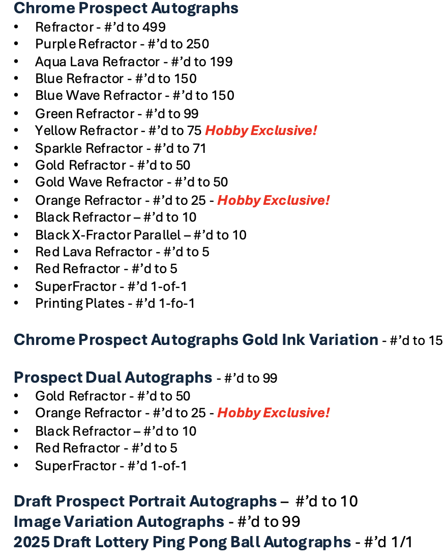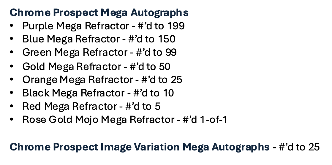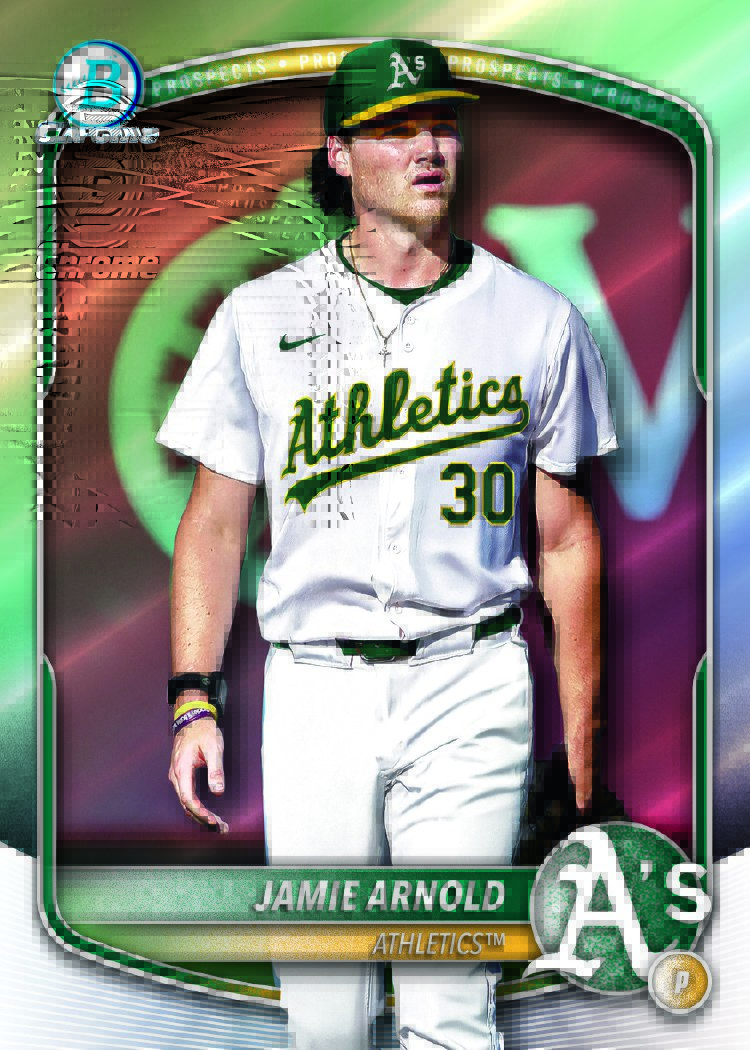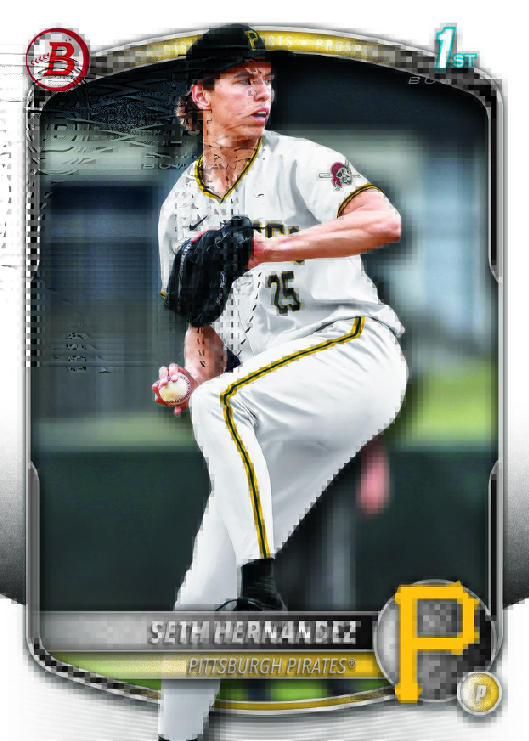 Update: Preliminary checklist added up top. Among the inclusions are Etched In Glass, Final Draft, College Variations, Prized Prospects, Axis, Bowman In Action and Draft Night. Also in there will be a Dream Draft Pick card set that "imagines a legendary athlete, originally drafted by an MLB team, in an alternate baseball timeline." ... Also in there for autos will be Gold Ink variations, duals and Achromatic Autographs "that bring fresh design innovation to Bowman’s signature style." ... Bowman Variety Packs will "add playful refractor patterns like Gum Ball, Sunflower Seeds and Pop Corn Chrome cards," while a Bowman Draft Mega Box will include Laser Refractors and Mega Autographs.