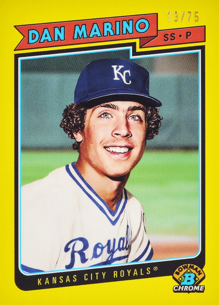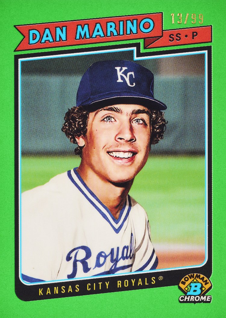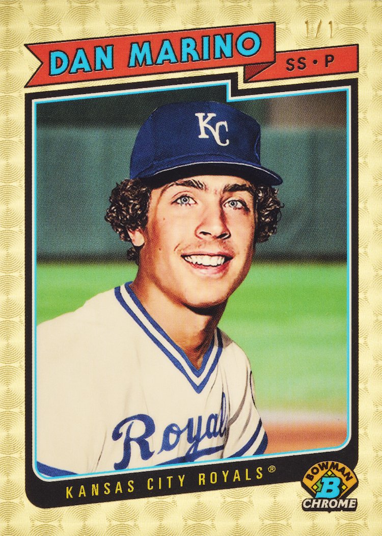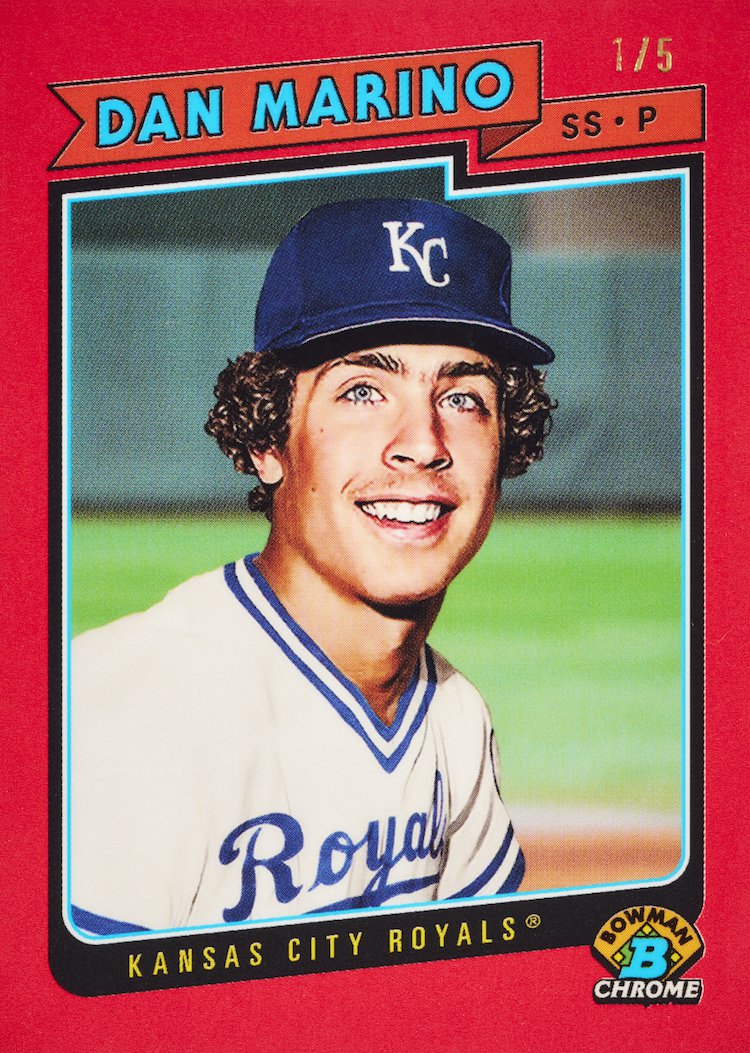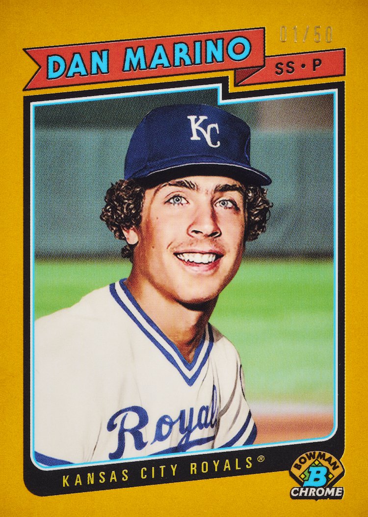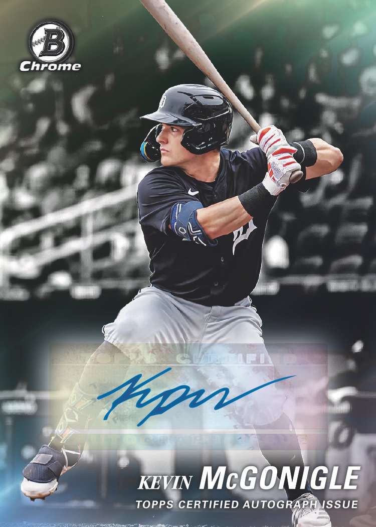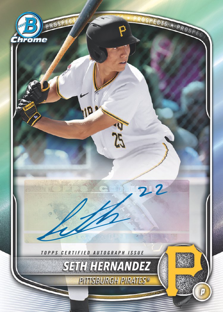 Update: Preliminary checklist added up top. Among the inclusions are Etched In Glass, Final Draft, College Variations, Prized Prospects, Axis, Bowman In Action and Draft Night. Also in there will be a Dream Draft Pick card set that "imagines a legendary athlete, originally drafted by an MLB team, in an alternate baseball timeline." ... Also in there for autos will be Gold Ink variations, duals and Achromatic Autographs "that bring fresh design innovation to Bowman’s signature style." ... Bowman Variety Packs will "add playful refractor patterns like Gum Ball, Sunflower Seeds and Pop Corn Chrome cards," while a Bowman Draft Mega Box will include Laser Refractors and Mega Autographs.