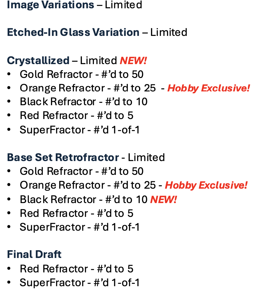 The Basics: Full details will be added here once formally unveiled. Among the teased inclusions are Crystalized, In Action autos, Spotlights cards and, of course parallels and ink for prospects.