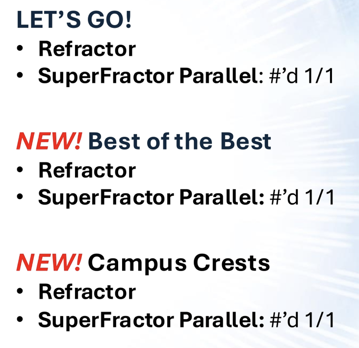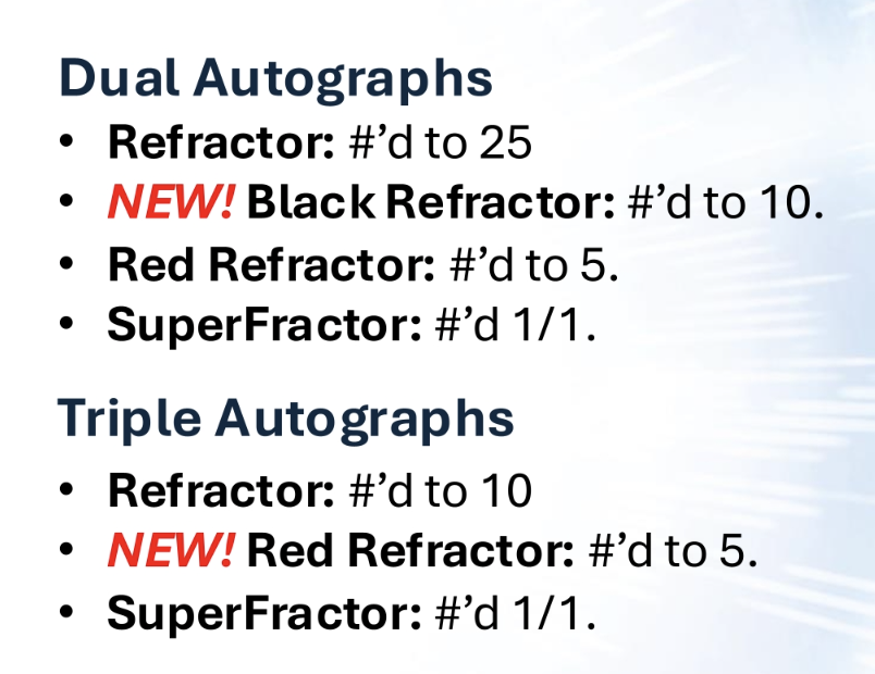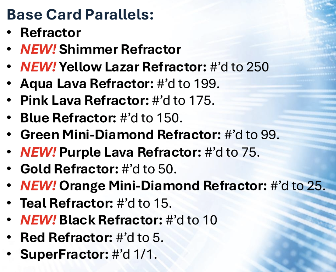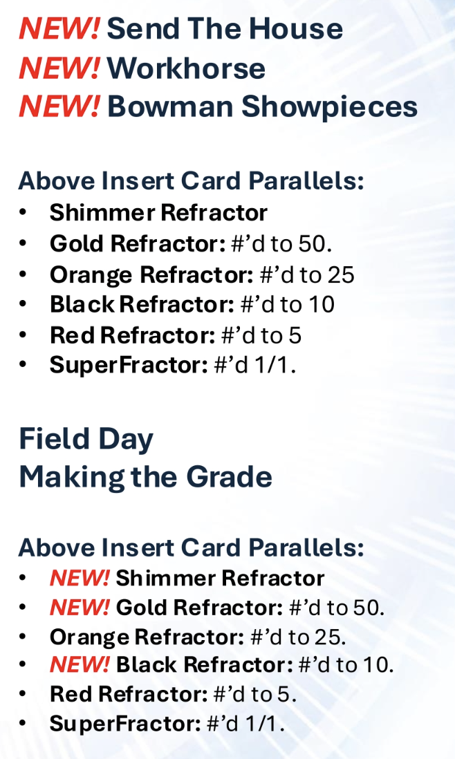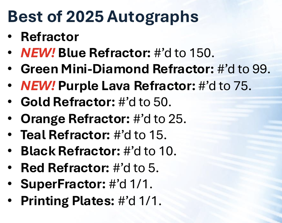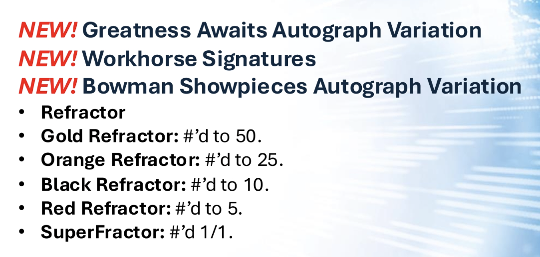The Basics: The early teasers are all we have right now, but those details do include a 199-card base set with some new parallels in the mix from a lineup that will include Yellow Lazar, Purple Lava, Orange Mini-Diamond and 1/1 Superfractors for starters. ... Among the inserts will be Campus Crests, Send The House, Workhorse, Making the Grade, Field Day and Bowman Showpieces. ... Among the hits will be Best of 2025 autos for 100 top prospects, Greatness Awaits, Top Prospects, Workhorse and then dual- and triple-auto cards. Also in there will be jumbo Relic autos with game-used material as well as dual Relic autos.
