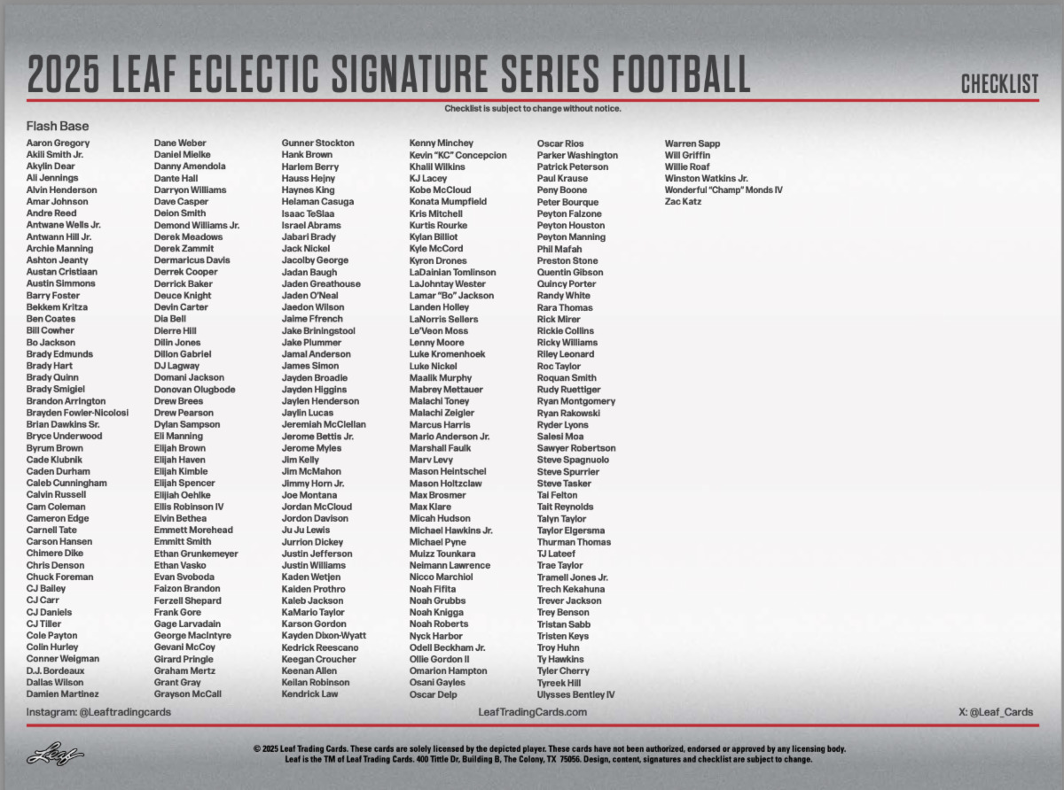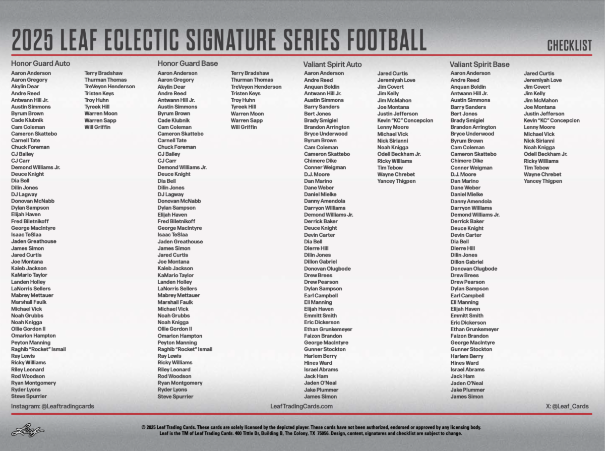 The Basics: Among the finds in this one will be Flash, Valiant, Pure, Flash Forward, Flash of Color, Flashback, Honor Guard, Valiant Spirit, Pure Excitement, Pure Adrenaline, Purely Heroic, Flash Mob, The Valiant, Pure Pairings and Mythical autos for starters. Both boxes will include six base cards with everything being a 1/1 creation -- so there will be plenty of colors and parallel styles as well as that deep checklist you can see in full below. ... Every case will include at least two and sometimes three multi-signer cards. Each case also will include four autographs from the following group every time: Ashton Jeanty, Barry Sanders, Bo Jackson, Cam Skattebo, C.J. Carr, Dan Marino, Demond Williams Jr., Emmitt Smith, Fernando Mendoza, Gunner Stockton, Ja’Marr Chase, Jeremiyah Love, John Elway, Justin Jefferson, Lamar “Bo” Jackson, LaNorris Sellers, Mason Heintschel, Peyton Manning, Eli Manning, Tim Tebow, Malachi Toney, Haynes King and Sawyer Robertson.