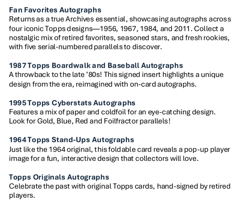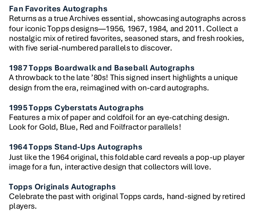 What's buzz-worthy: Topps Archives will arrive for MLB fans once again with a mix of past and present favorites appearing on a variety of past designs all in one spot.
