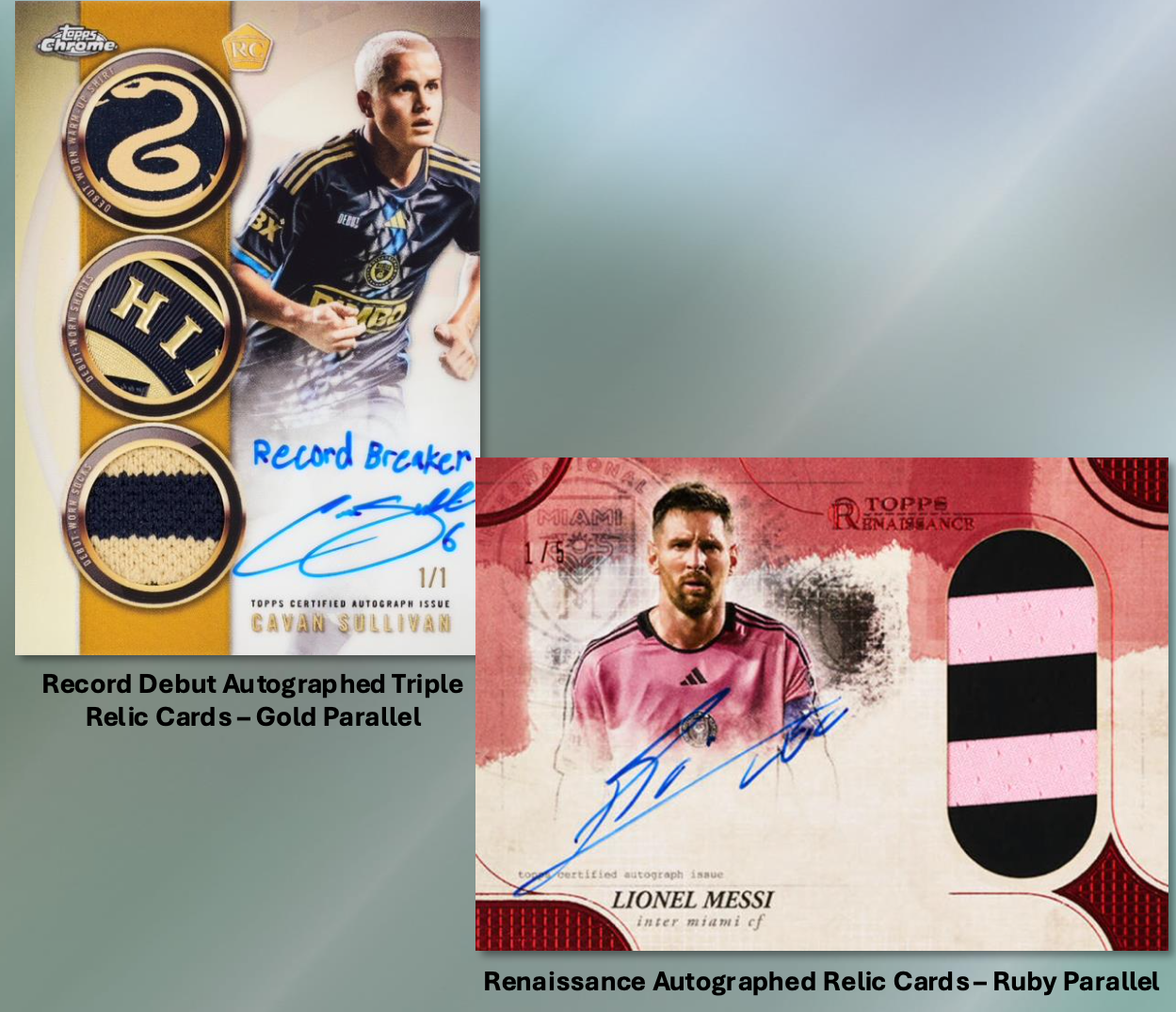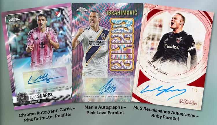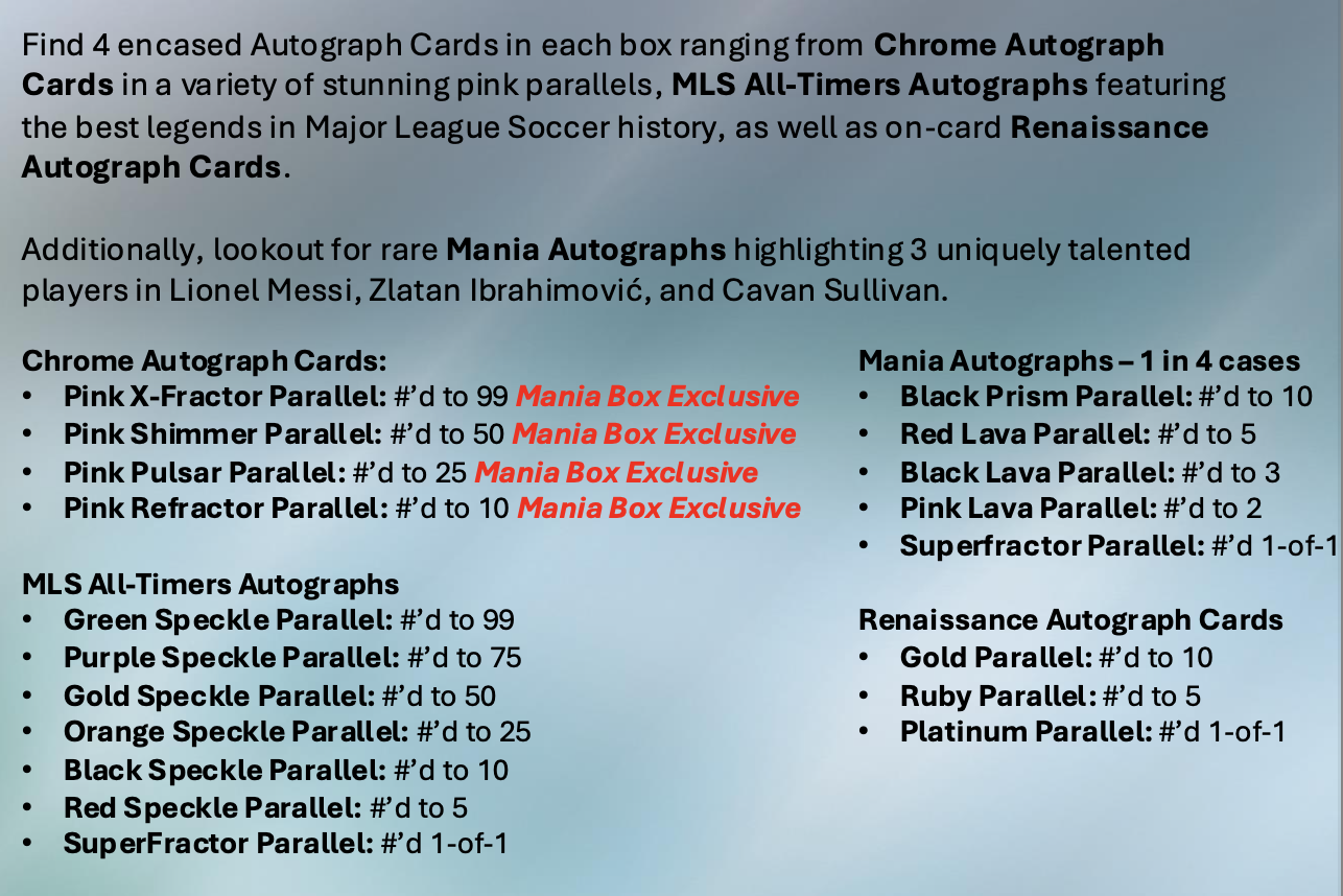 The Basics: A typical box will include five serial-numbered Refractors, three other Refractors, four Prism parallels, one Lava parallel and nine other inserts. Each box will include one four-card 30th Anniversary Celebration pack, while each case will include one Big City Strikers Skylight variation. ... Among the rarer chases here are MLS Debut patch autos, Renaissance autos, Cavan Sullivan Rookie Arrival patch autos and Lionel Messi Renaissance auto Relics. ... Base parallels are noted in the gallery below, while inserts will have MVP, Big City Strikers, Pearlers, Fast Lane, Elimination, Class of Their Own, Helix, The Grail and a 1/1 MLS Trophy card. ... Among the auto sets will be base auto parallels, duals, Renaissance and MLS Anniversary booklets, while MLS x Apple TV patch cards will showcase two players per team on 1/1 cards. ... The Celebratoopm packs will carry a 1995 Topps design for both base cards and autographs.