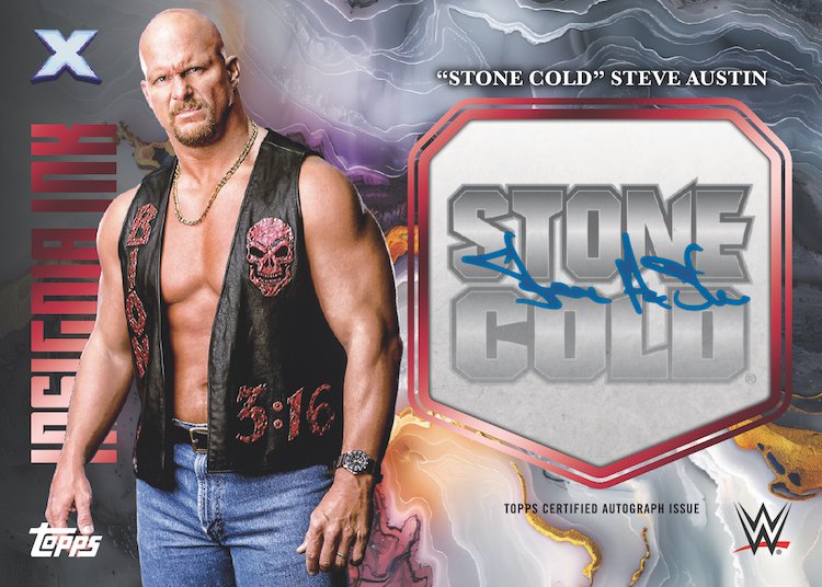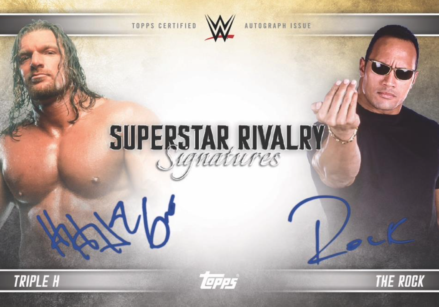 Update (March 3): There will be one base card, one serial-numbered parallel, two autos and one Relic per box here. Also among the Relics are Mega Materials and Quad Relics, while other auto sets will include Streamline Signatures, Ambient Autographs, Apparition Autographs and The Last Time Is Now autos from Cena. Auto parallels will include Aqua (/99), Green (/50), Blue (/25), Red (/5) and 1/1 Black. There also will be The Rock Retrospective autos (/10) with Red (/5) and 1/1 Supers. Joining them will be Celebrating Cena autos (/10), Triple H Tribute autos (/10), Superstar Rivalry Signatures (/5) with 1/1 Supers and then Superstar Rivalry Variation Signatures (/25) with Black (/10), Red (/5) and 1/1 Supers in play.